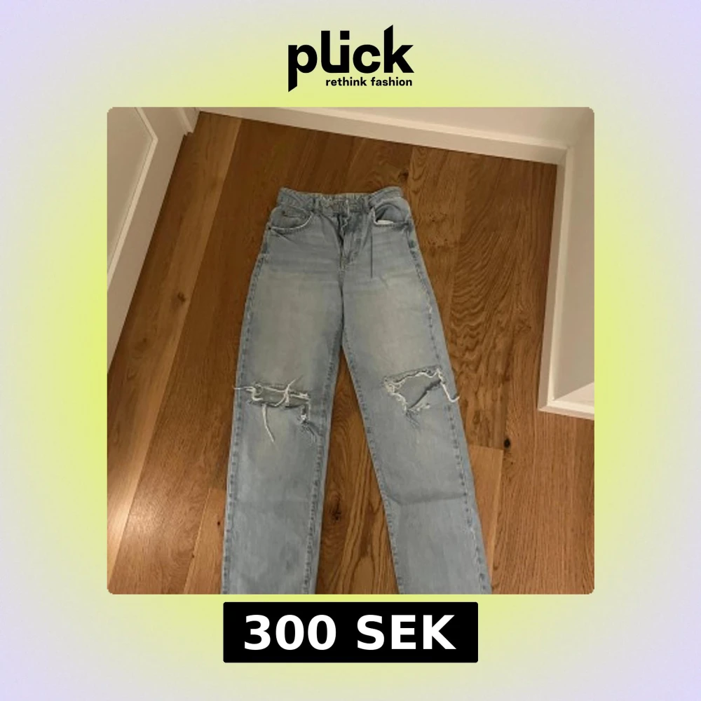Säljer ett par ljusa jeans med slitningar på framsidan. De har en straight passform och är i storlek W26 L32. Det enda är att slitningarna är lite extra slitna från när jag köpte dem.