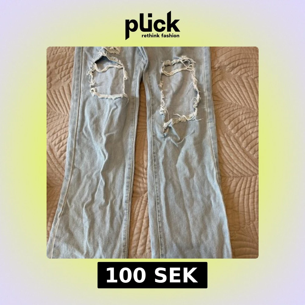 Säljer ett par ljusa jeans med stora slitningar på knäna. De har en straight passform och är perfekta för en avslappnad stil. Jeansen har en klassisk design med fem fickor och knappgylf.