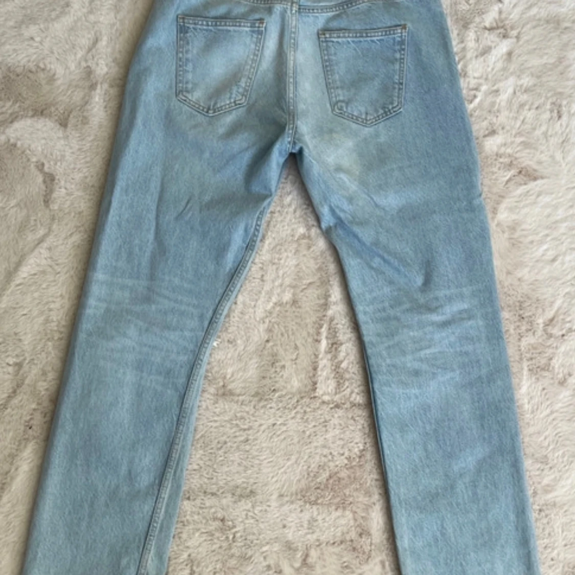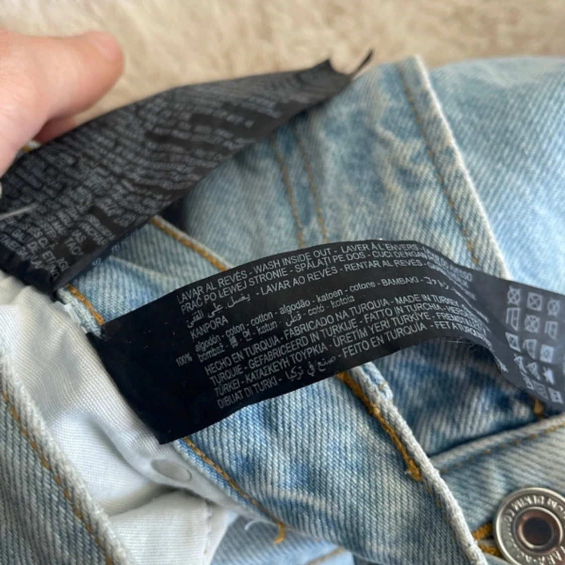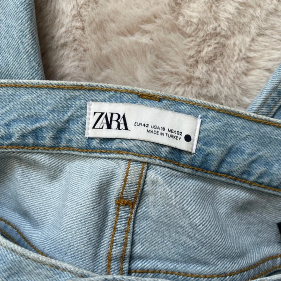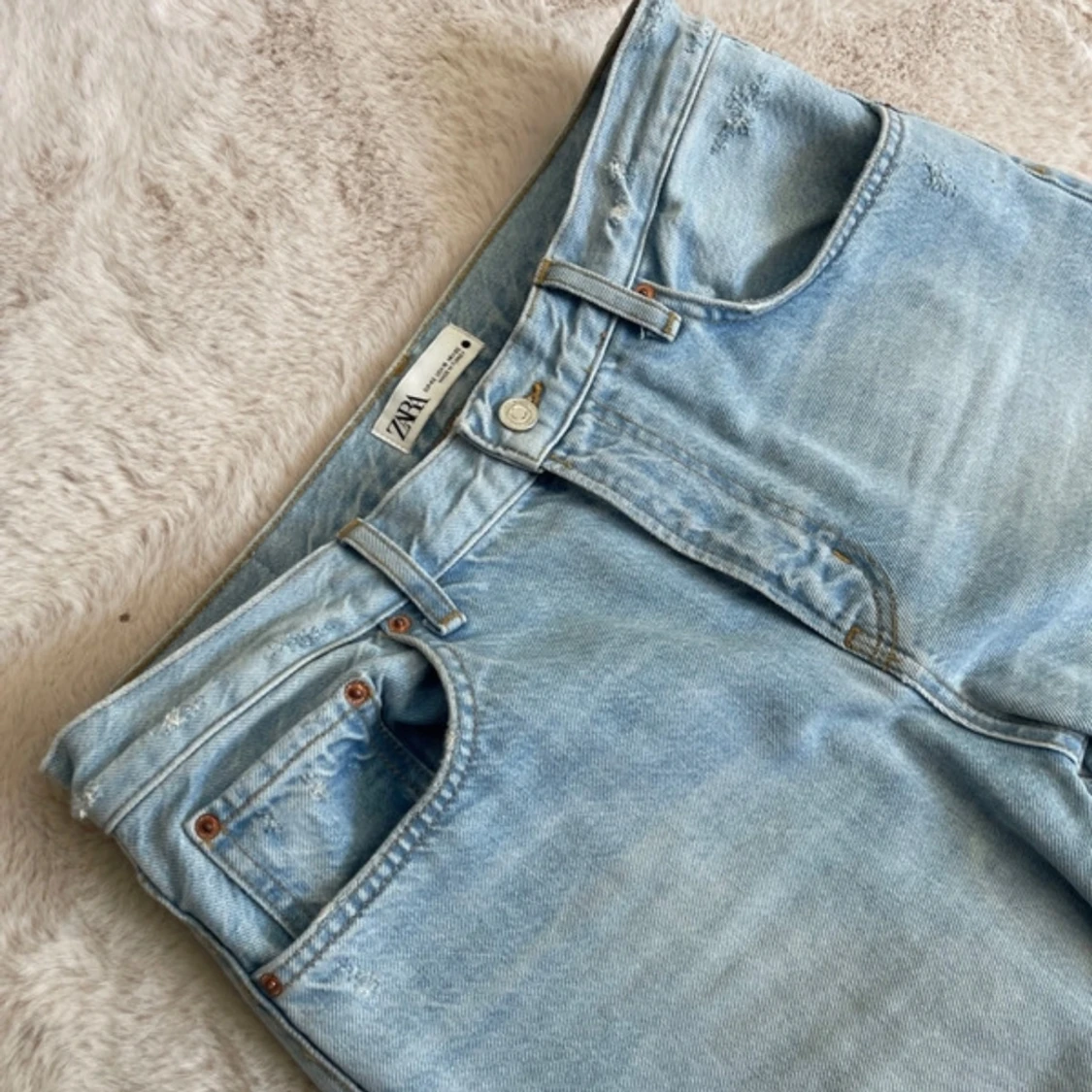 Snygga ljusblå jeans från Zara med slitningar på knäna. Perfekta för en avslappnad stil. Tillverkade i Turkiet.