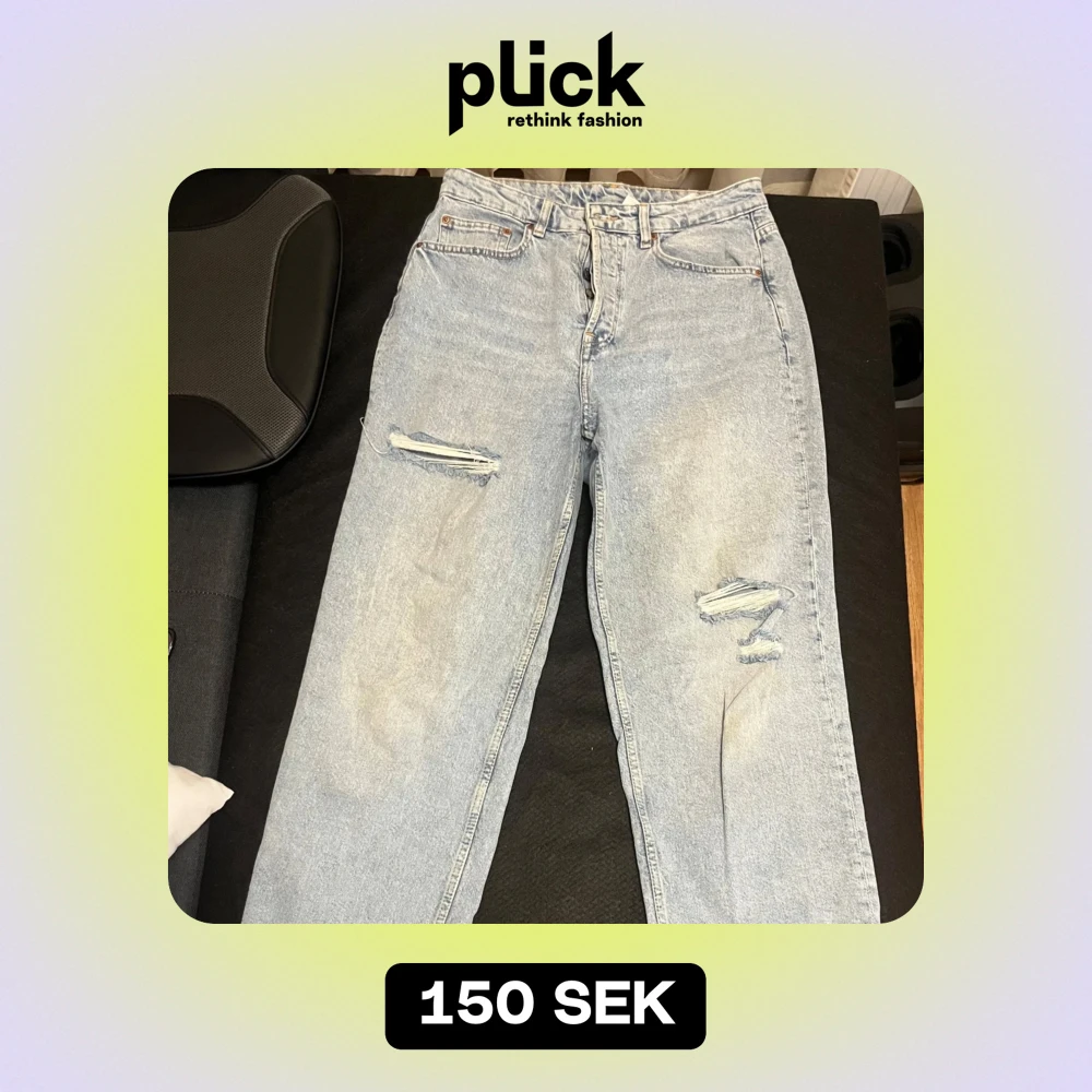 Säljer ett par ljusa jeans med slitningar på låren. De har en avslappnad passform och är perfekta för en casual look. De är också high waisted.