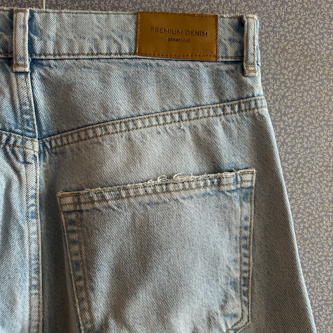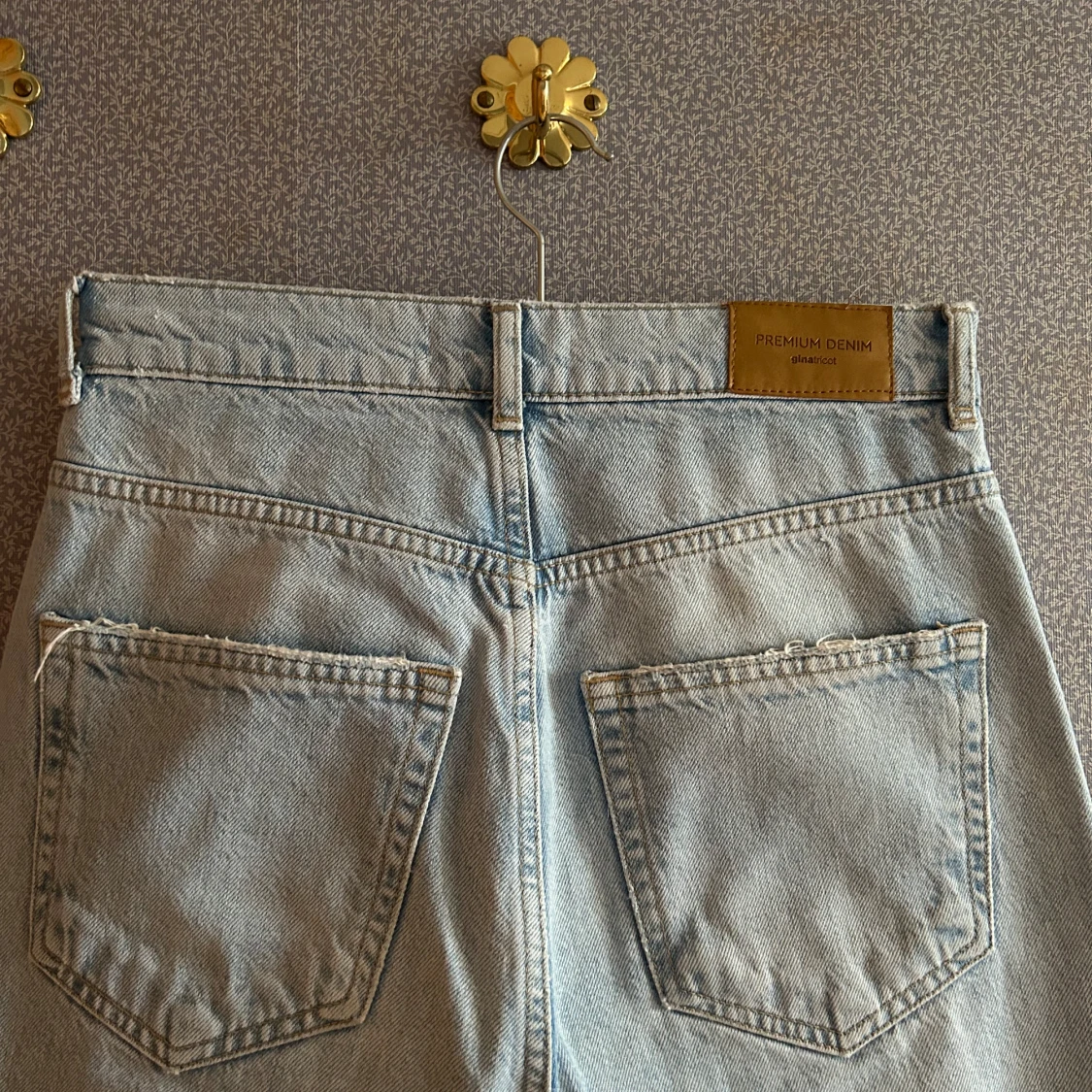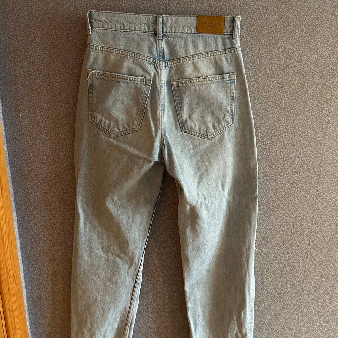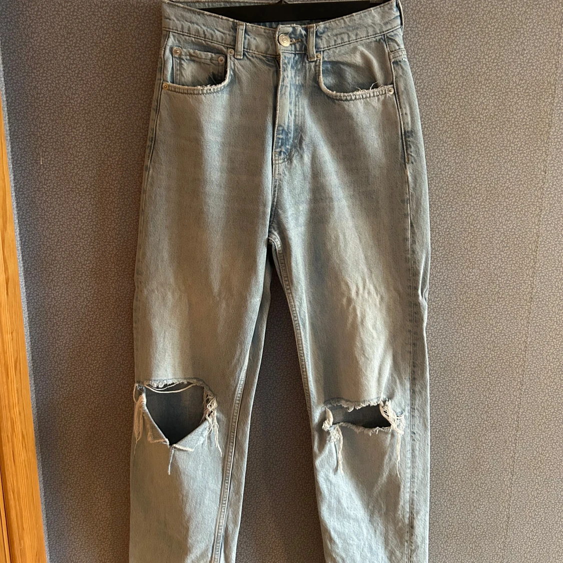 Snygga ljusa jeans med slitningar på knäna. De har en klassisk femficksdesign och en knappgylf. Perfekta för en avslappnad stil.