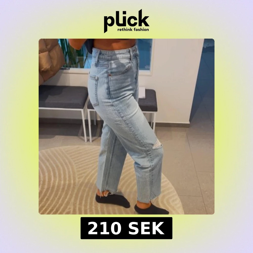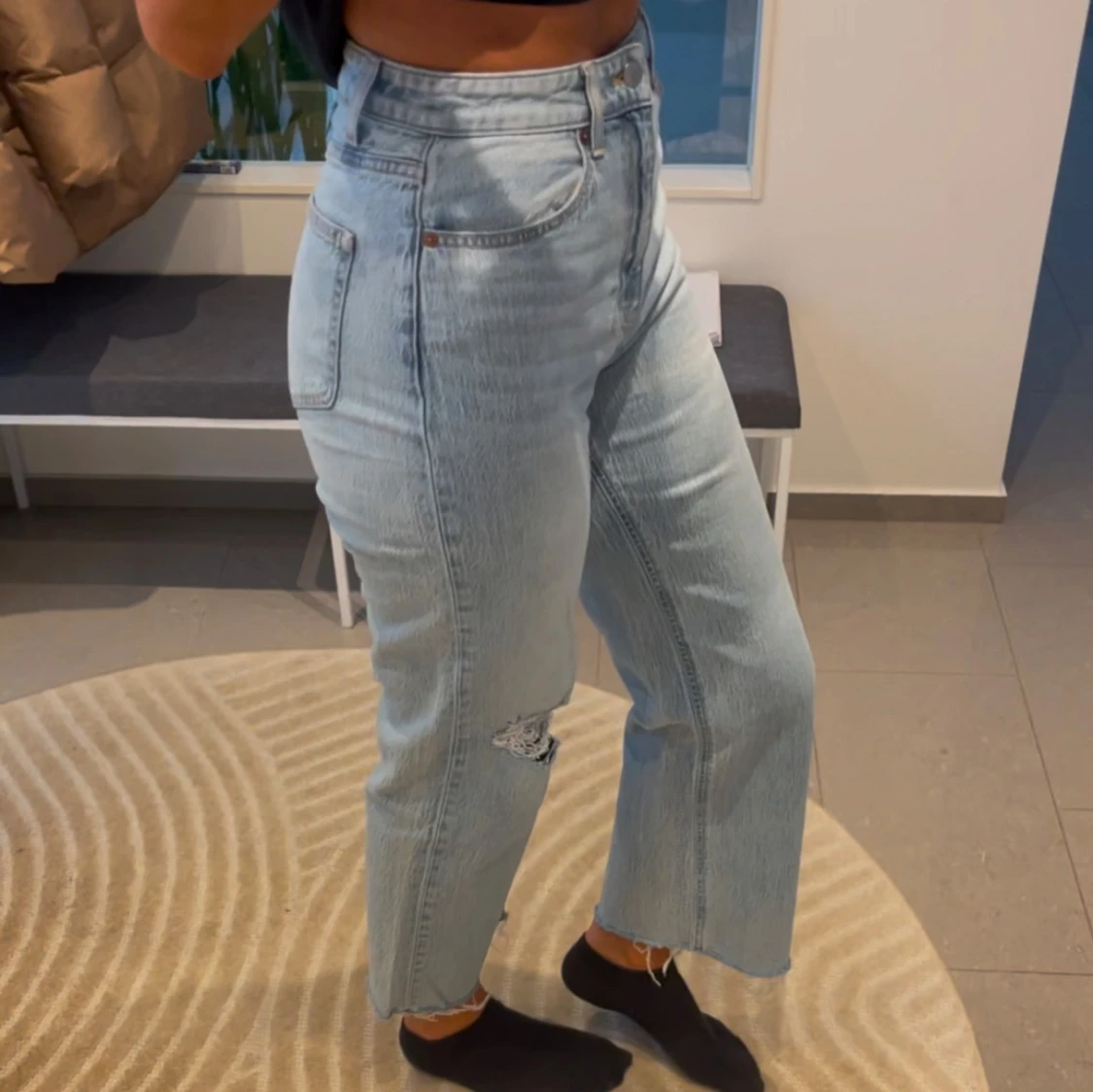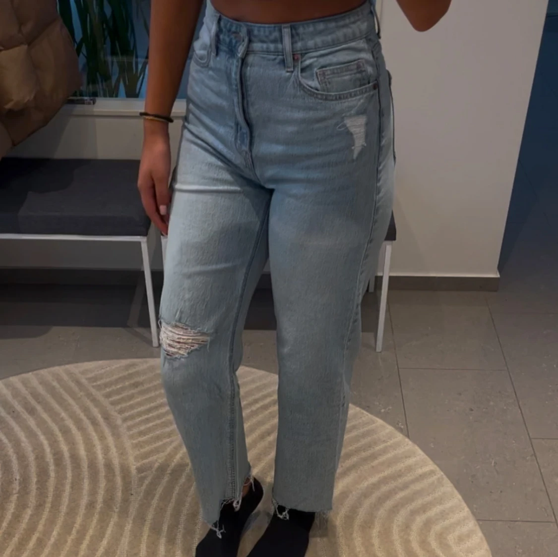 Snygga ljusblå jeans med hög midja och slitningar på benen. De har en straight passform och är perfekta för en avslappnad stil. Jeansen har klassiska fem fickor och en dragkedja med knapp framtill.