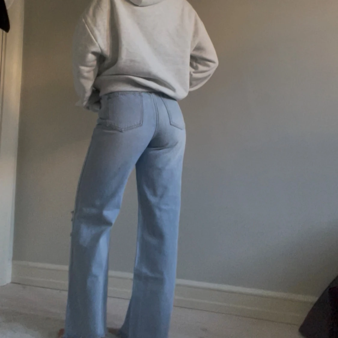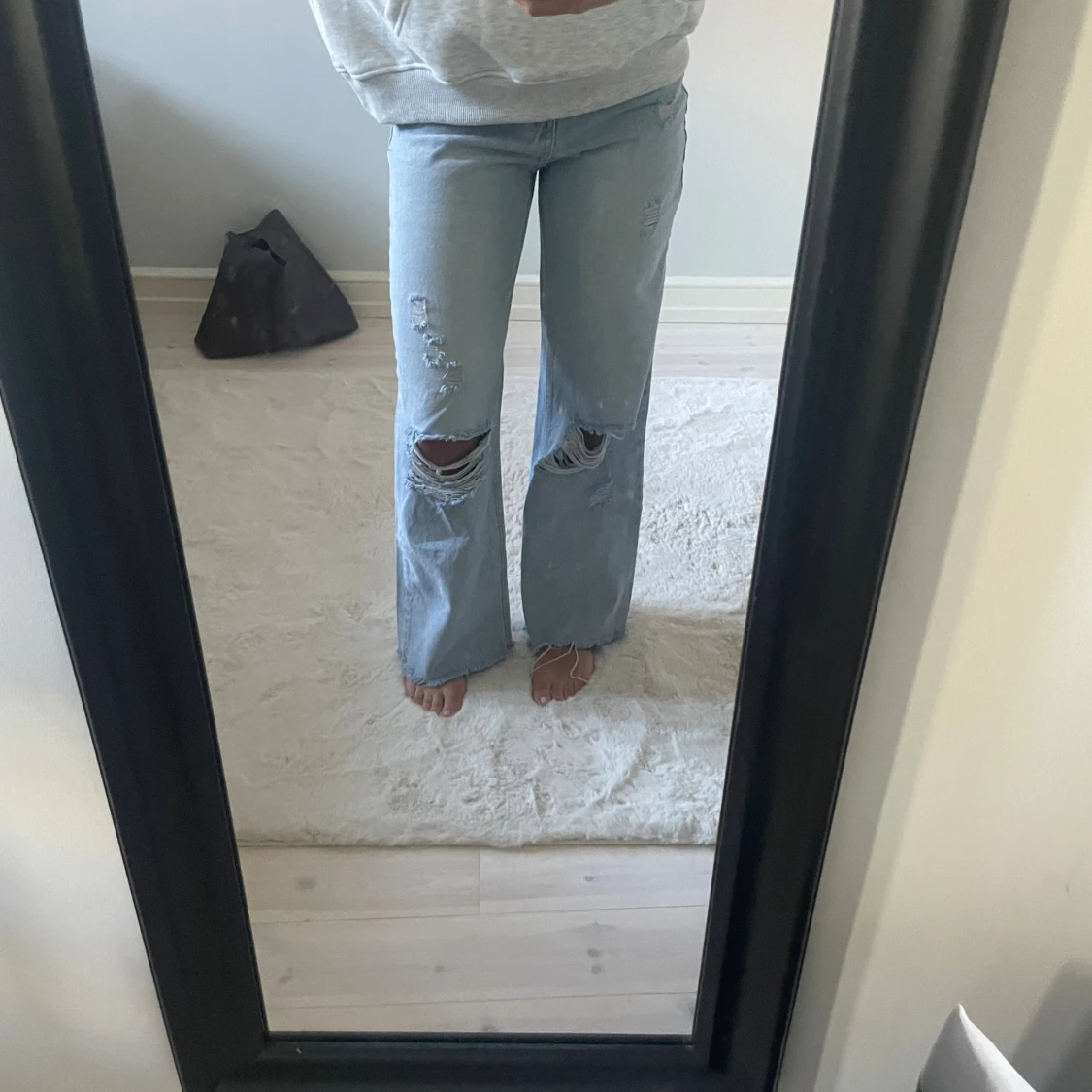 Säljer dessa coola ljusblå jeans med raka ben och slitna detaljer över knäna.