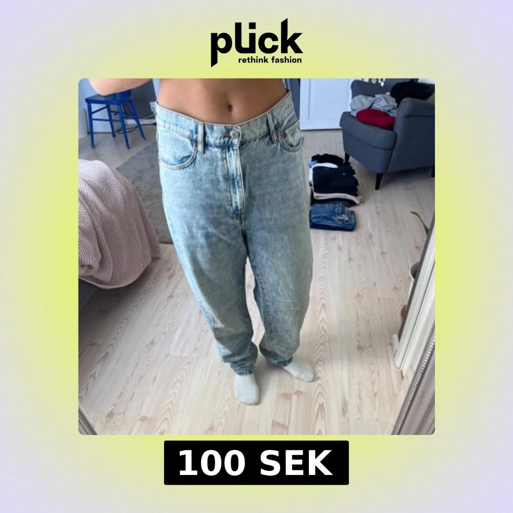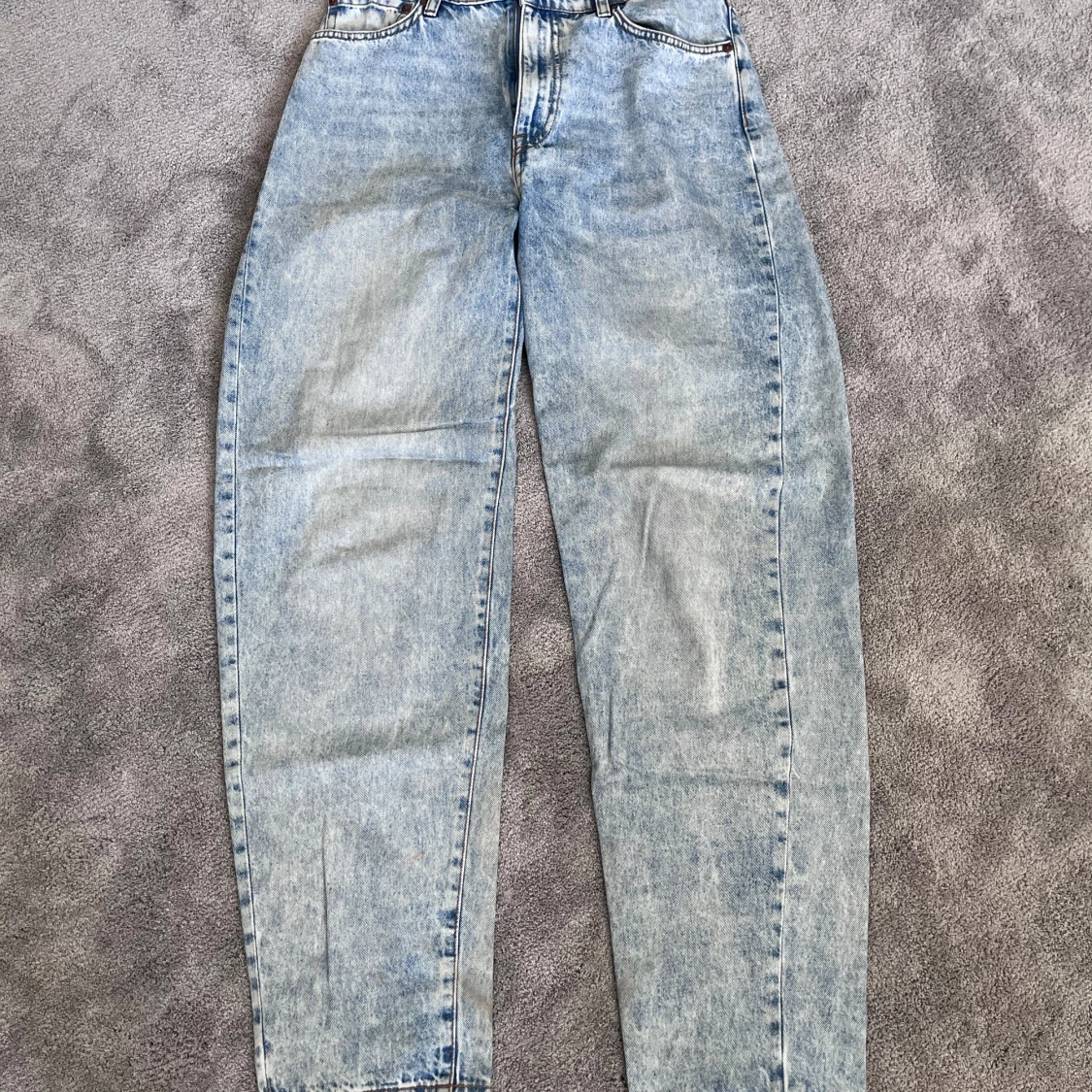 Säljer ett par ljusblå baggy jeans med klassisk femficksdesign och hög midja. Jeansen har raka ben och stängs med dragkedja och knapp.