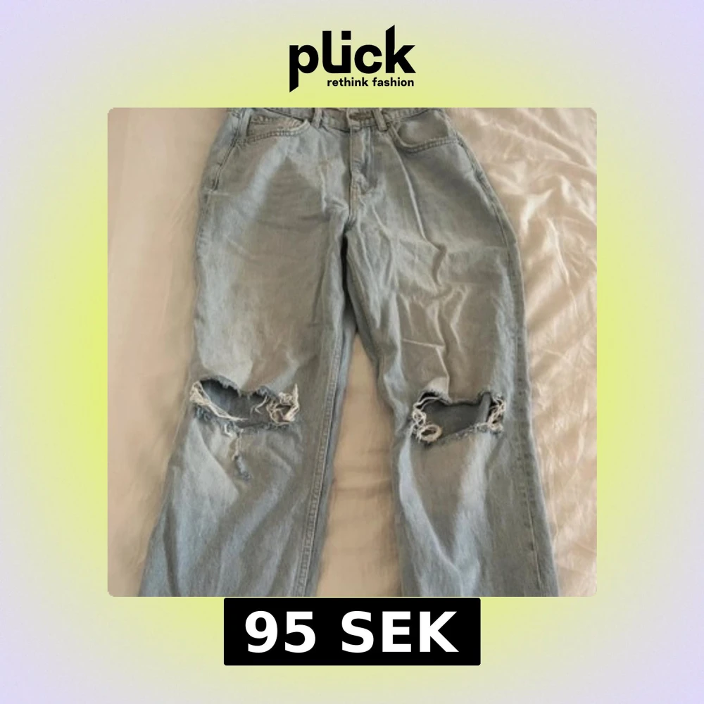 Säljer ett par ljusblå baggy jeans med raka ben och slitna hål på båda knäna. Klassisk femficksmodell med hög midja och knappgylf.