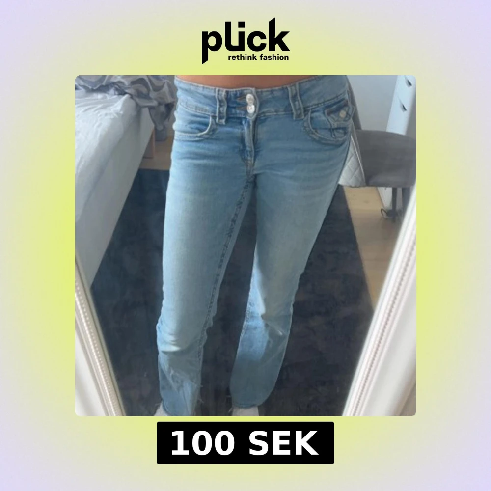 Säljer ett par ljusblå jeans från Gina Tricot i klassisk bootcut-modell. Jeansen har låg midja och är i storleken 164 som passar mig och jag är 166cm. Skriv om ni undrar något mer!