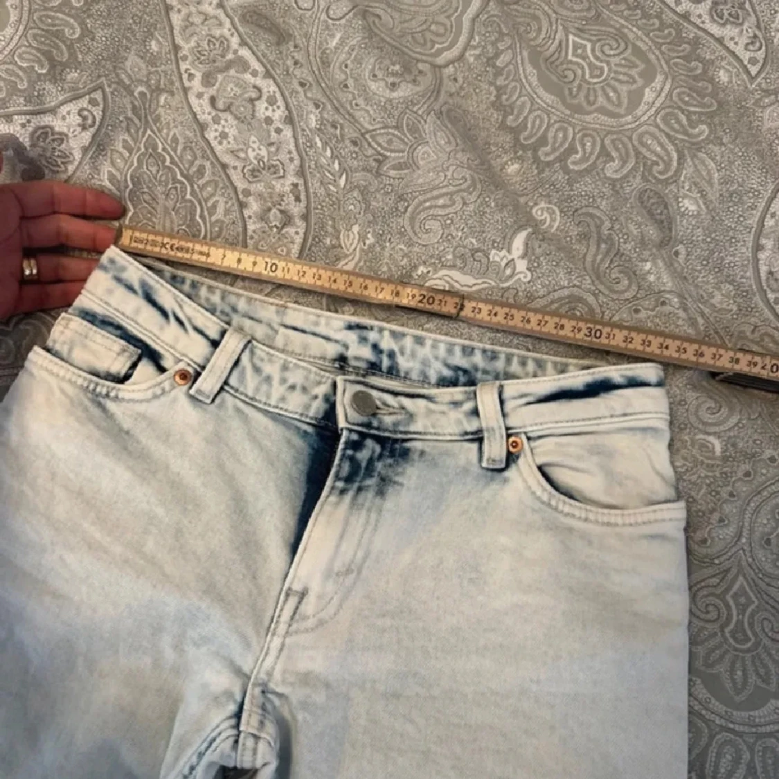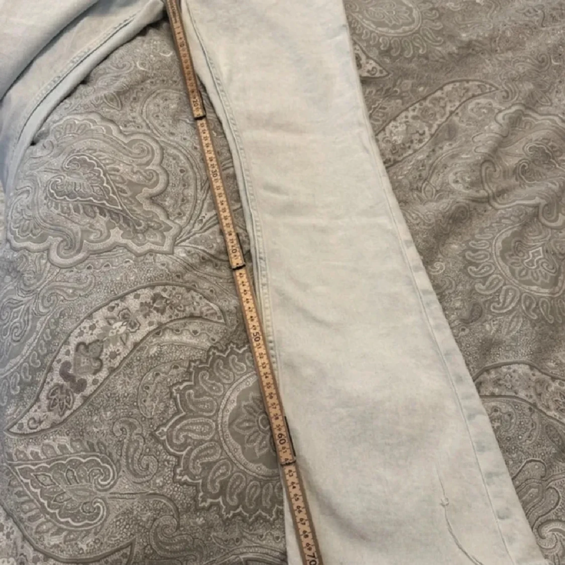 Säljer ett par ljusblå bootcut jeans med låg midja och råa kanter nertill. Jeansen har klassisk femficksdesign och stängs med dragkedja och knapp. Bilderna är från henne jag köpte av. Storleken är 24/32