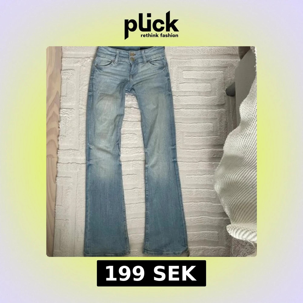 Säljer ett par lågmidjade ljusblå jeans med bootcut passform och dubbla knappar i midjan. Jeansen har slitningar längst ner vid bensluten, då de varit lite långa på mig som är 165. Skulle säga att de passar perfekt på någon som är 170. Annars i bra skick!! Hör av er vid frågor!🩵