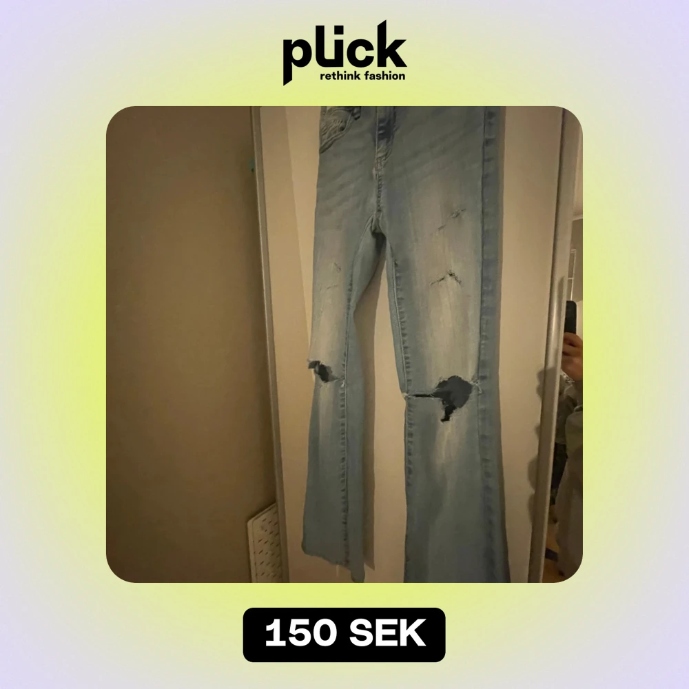 Säljer ett par ljusblå bootcut jeans i storlek 152. De har en cool slitning på knäna och en klassisk femficksdesign. Perfekta för en avslappnad stil med en touch av edge. Passar bra till både vardag och fest!