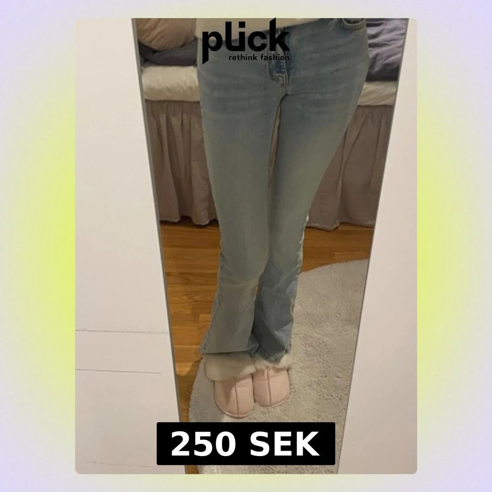Säljer ett par ljusblå bootcut jeans från Gina, de har normalhög midja, klassisk femficksdesign och är tillverkade i mjukt jeansmaterial 💗knappt använda! ☺️