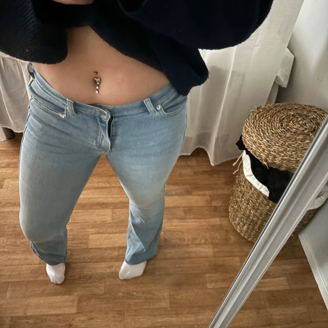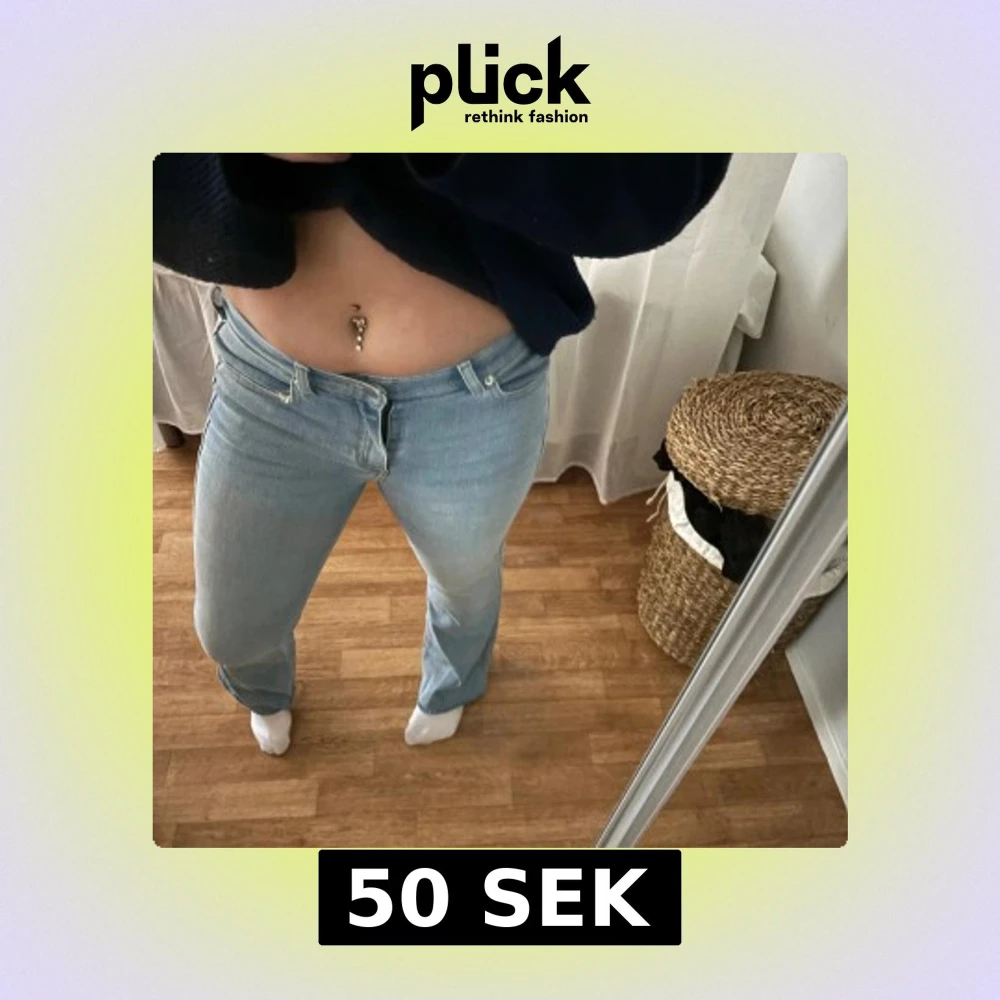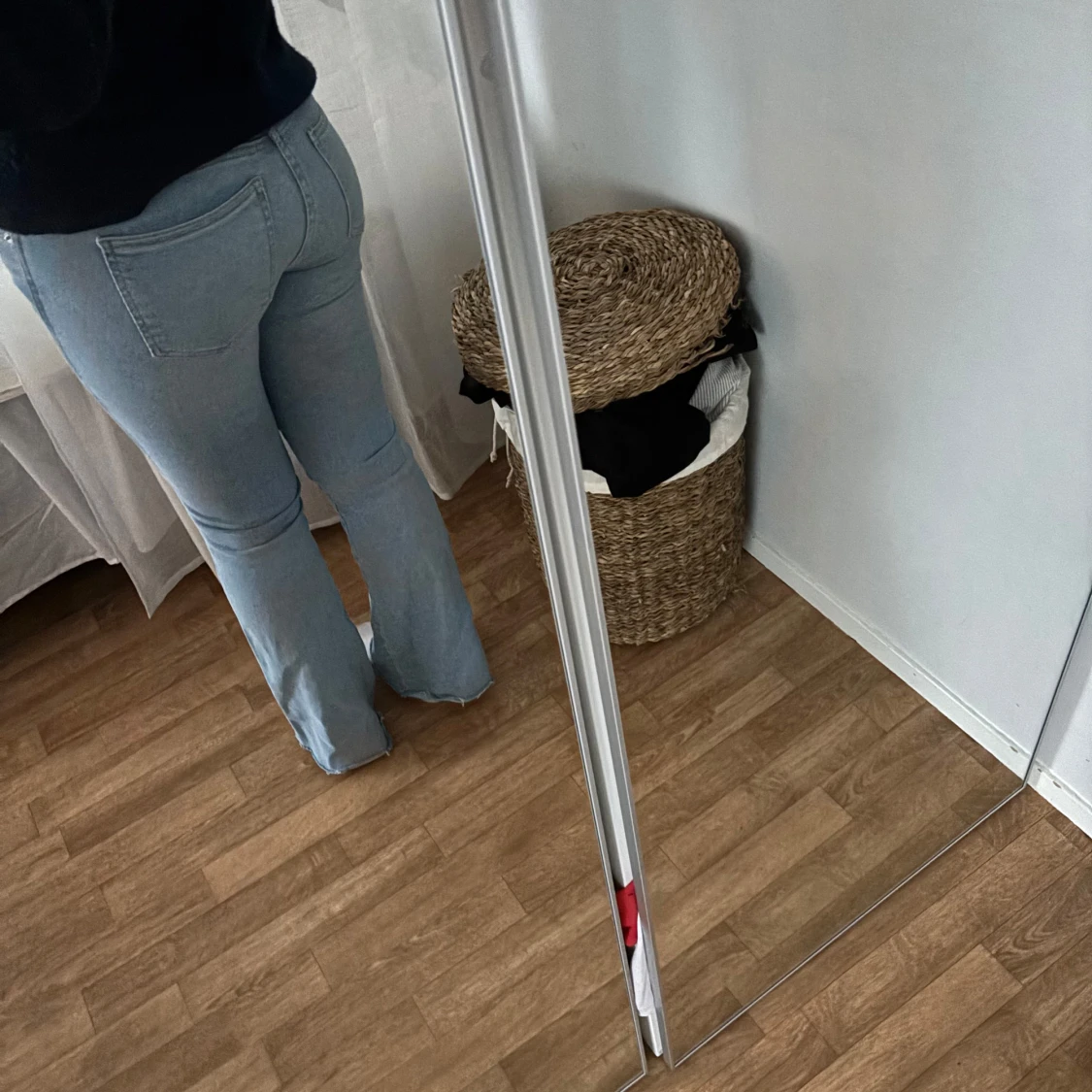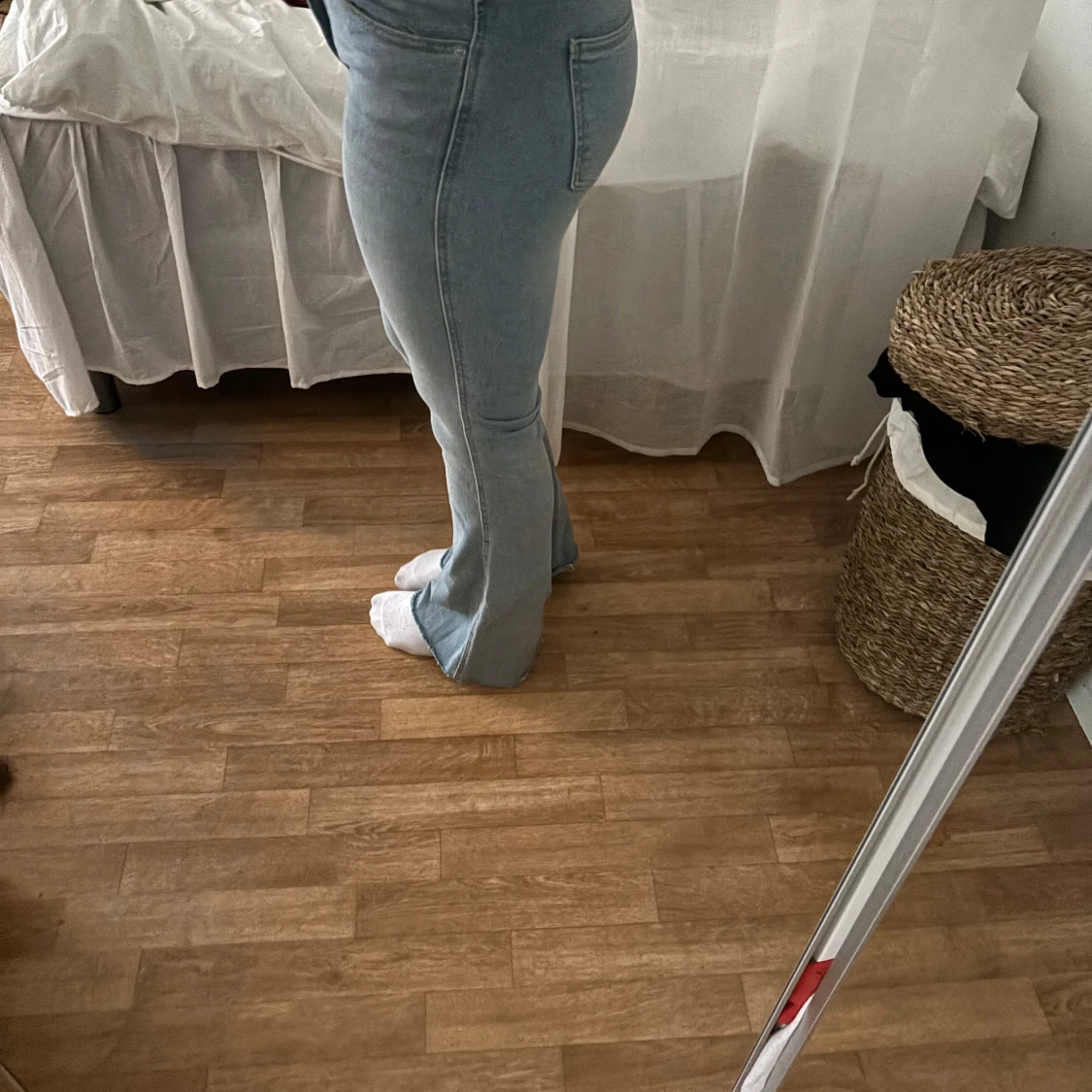 Säljer ett par ljusblå jeans med bootcut-modell och klassisk femficksdesign. Jeansen har normal passform och är tillverkade i mjukt denimtyg som sitter snyggt över höften och låren och släpper ut vid bensluten. Perfekta för en avslappnad och trendig look. Jag är 164cm och dom är jätte bra i längden dom är försmå för mig