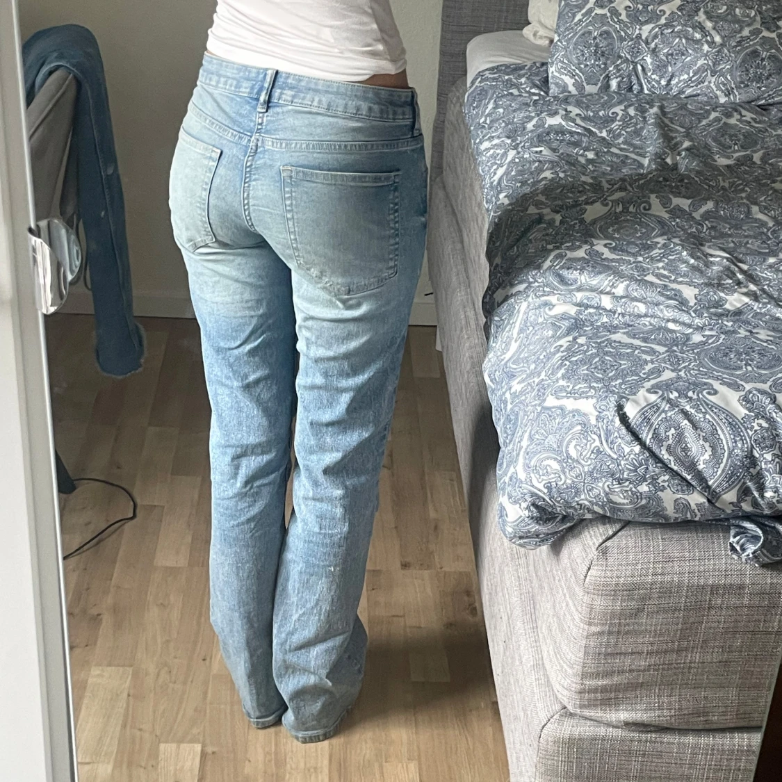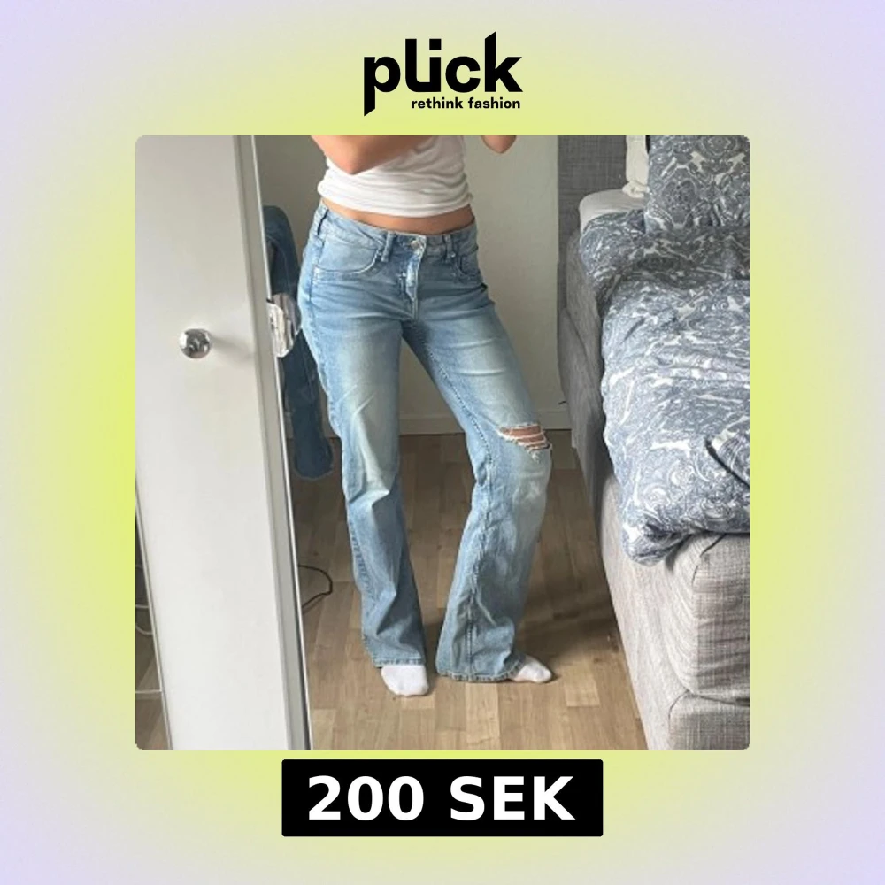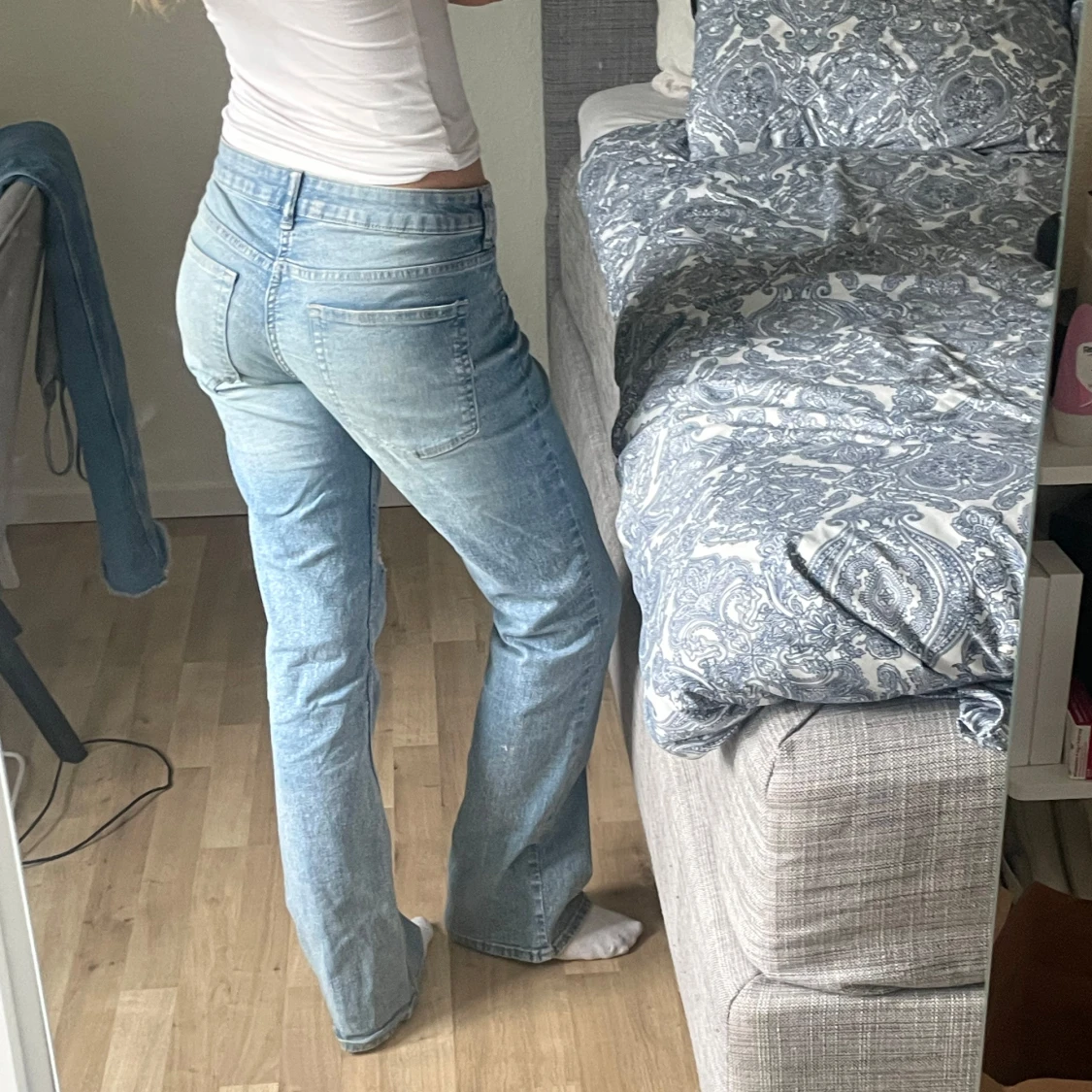 Säljer ett par ljusblå bootcut jeans med slitning och hål på ena knät. Jeansen har klassisk femficksdesign, normal passform och är lågmidjade. Perfekta för en avslappnad och trendig look.