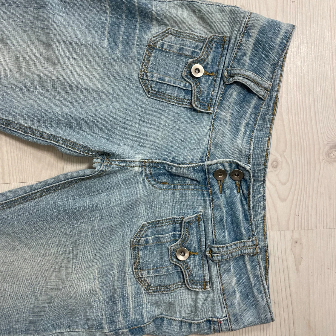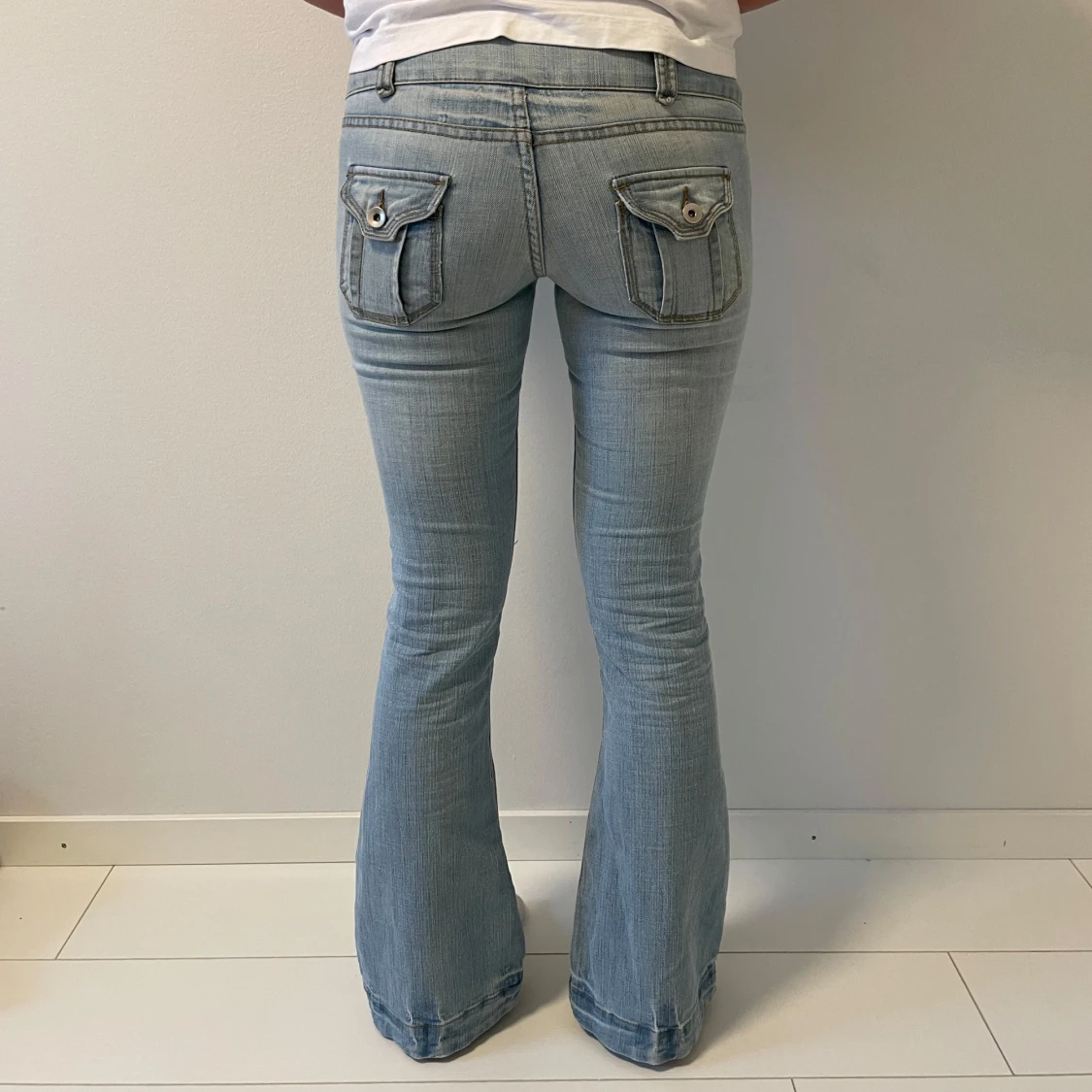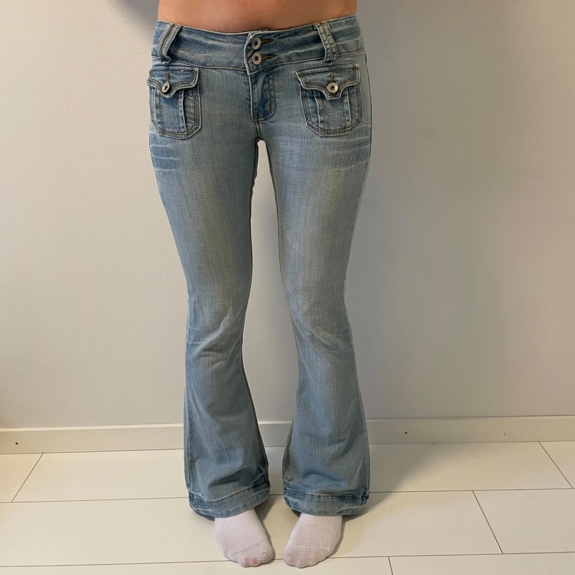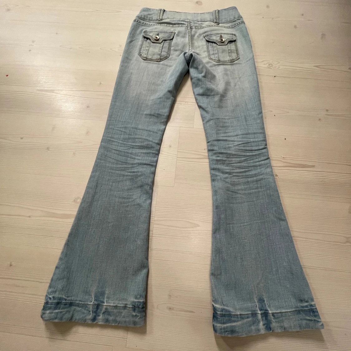 Snygga ljusblå bootcut jeans med dubbla knappar och fickor med lock fram och bak. Midjemåttet 39, Innerbenslängd 81, Ytterbenslängd 102 och grenmåttet 19. Jag är 167💗