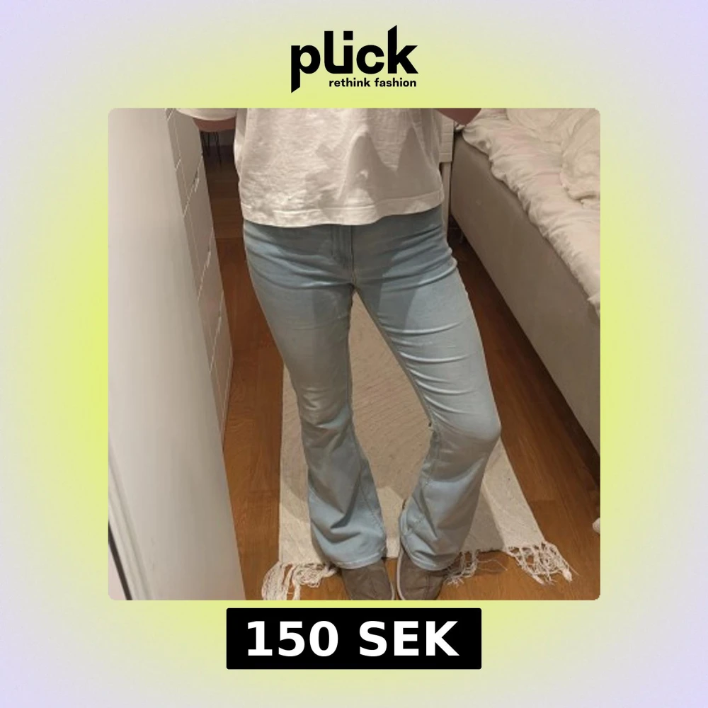 Säljer ett par ljusblå bootcut jeans från Lindex i modellen Freja, de på bild 4 är samma jeans fast i en mörkare färg. Jeansen är stretchiga och mid waist. För referens är jag 170 cm lång och dessa är precis ner till marken. De är i barnstorlek 170 men jag har vanligtvis 36 och de passar perfekt. Som man ser på bild 5 så har det vissa färgskiftningar, de har varit där sedan jag köpte dom💞💞