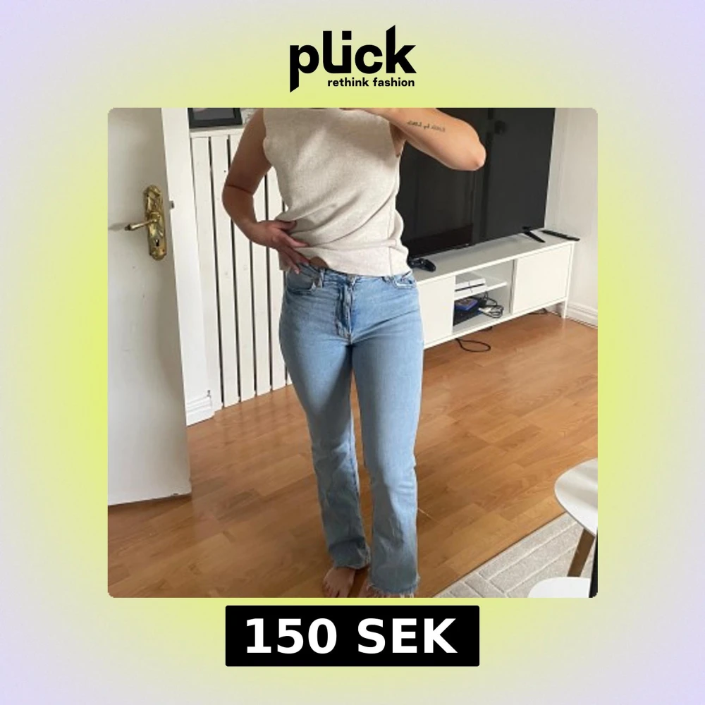 Säljer ett par ljusblå jeans med bootcut-modell och slitningar nertill, superfina verkligen. Innerbenslängden är 71/72cm 🥰