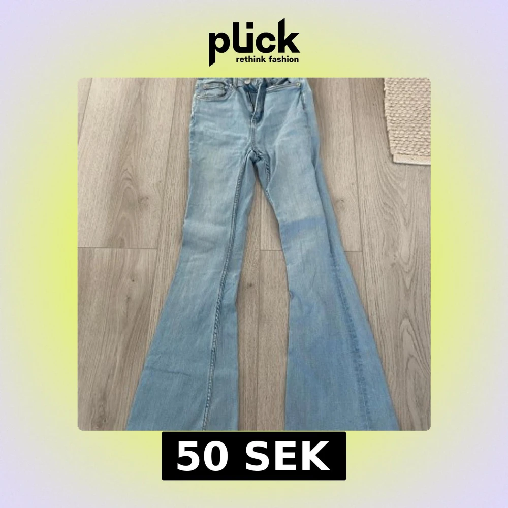 Säljer ett par ljusblå jeans från 157 i klassisk bootcut-modell med utsvängda ben. Jeansen har fem fickor, gylf med dragkedja och knapp samt snygga kontrastsömmar. Perfekta för dig som gillar retrovibbar och vill sticka ut lite extra.