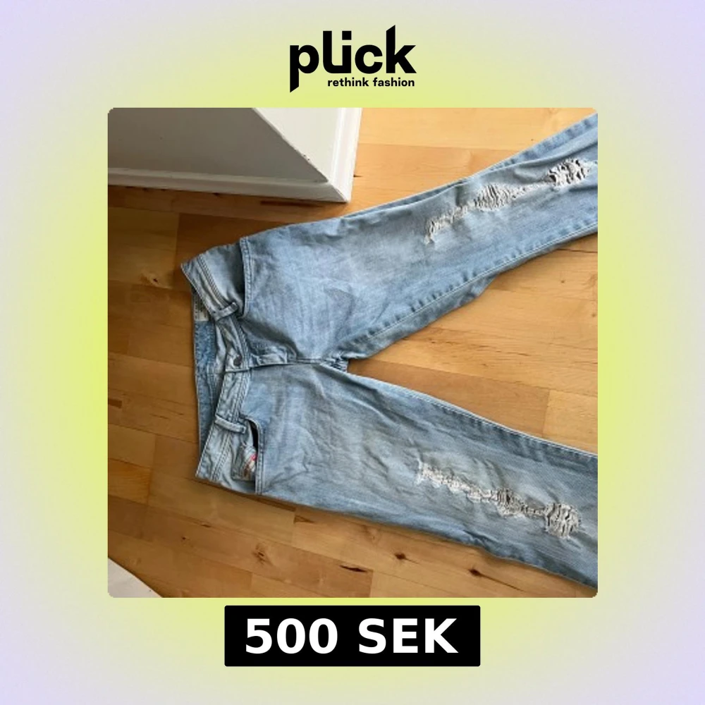Säljer ett par lågmidjade ljusblå jeans från Diesel med bootcut passform och slitna detaljer på båda benen. Jeansen har klassisk femficksdesign, knapp och dragkedja i gylfen samt Diesel Industry-märke vid fickan. Tillverkade i jeansmaterial.