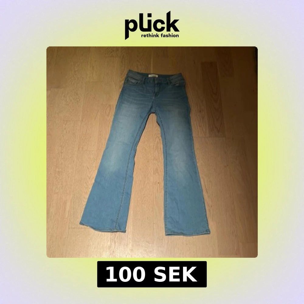 Ljusblå jeans från Lindex i storlek 164 med bootcut-ben och klassisk femficksdesign. Jeansen har en slim passform upptill och är tillverkade i mjukt denimtyg. Perfekta för dig som gillar en retroinspirerad look med utsvängda ben.