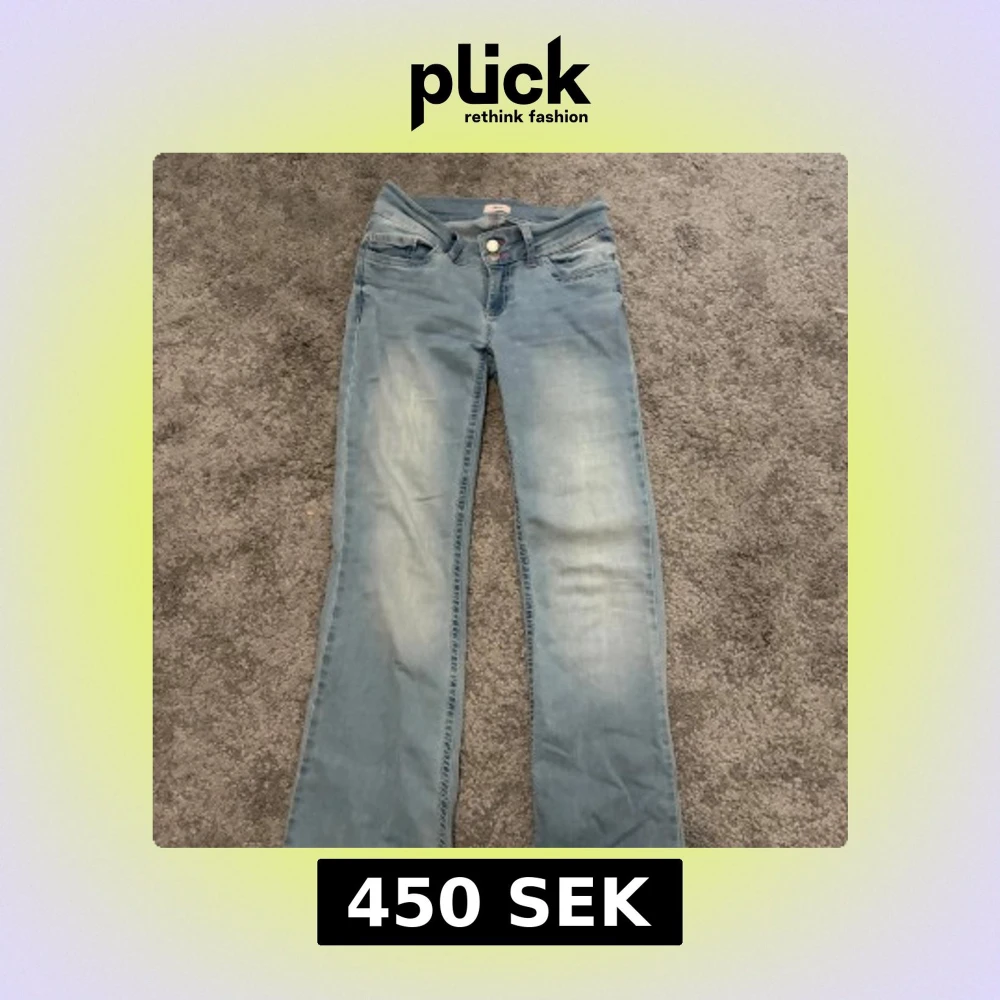 Säljer ett par väldigt populära ljusblå bootcut jeans från Nelly med dubbla knappar i midjan. Jeansen har en snygg tvätt och är tillverkade i mjukt bomullsmaterial med lite stretch. En liten defekt ser ni på sista bilden! Använda fåtal gånger
