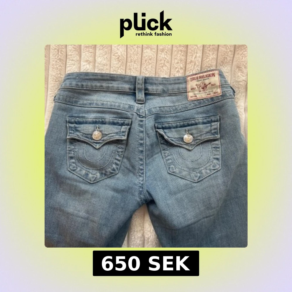 Säljer ett par ljusblå jeans från True Religion med bootcut passform och låg midja. De sitter jättefint men har lite defekter längst ner, se bilder.