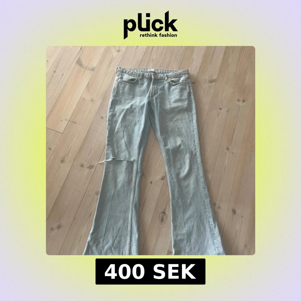 Säljer ett par ljusblå bootcut jeans från Zara med klassisk femficksdesign. Jeansen har en snygg sliten detalj på ena benet och stängs med knapp och dragkedja. Perfekta för dig som gillar en retroinspirerad look. Midjemått 40cm innerbenslängd 82🫶