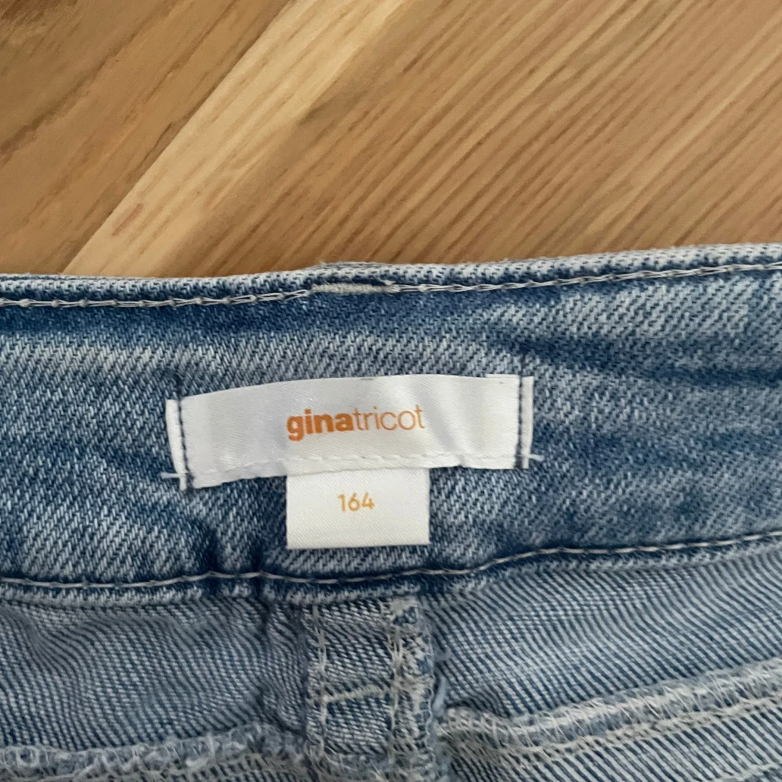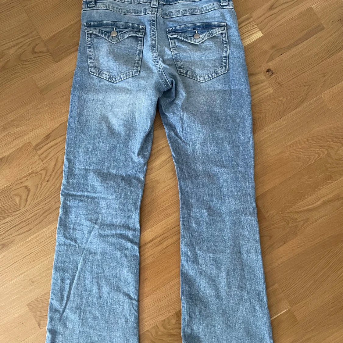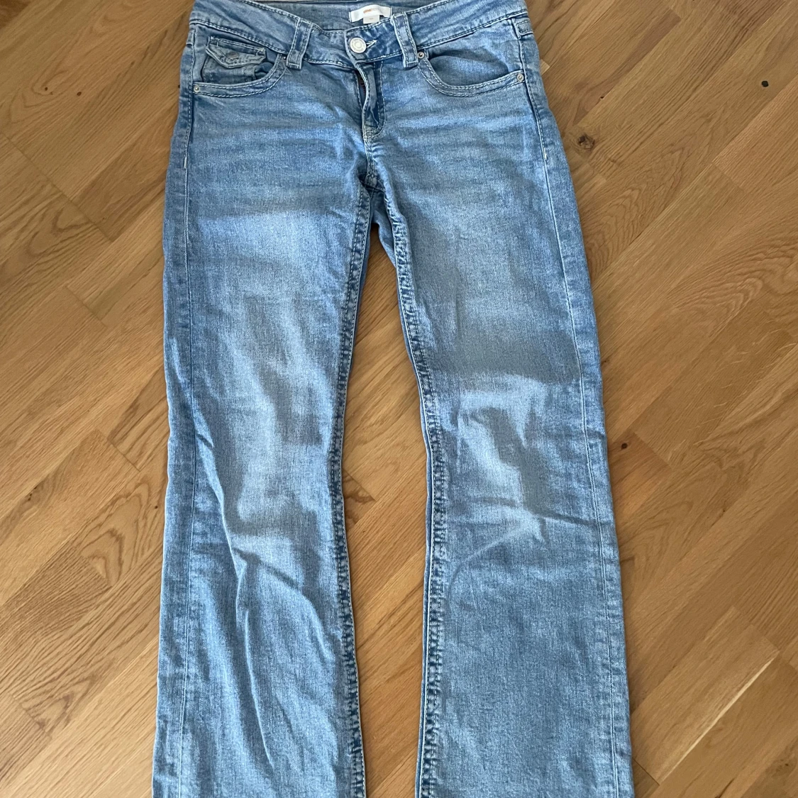 Snygga ljusblå jeans från Gina Tricot i klassisk bootcut-modell. Jeansen har låg midja, fem fickor och coola detaljer på bakfickorna. Tillverkade i mjukt bomullsjeans-tyg med en lätt tvättad look. Perfekta för en avslappnad och trendig stil.