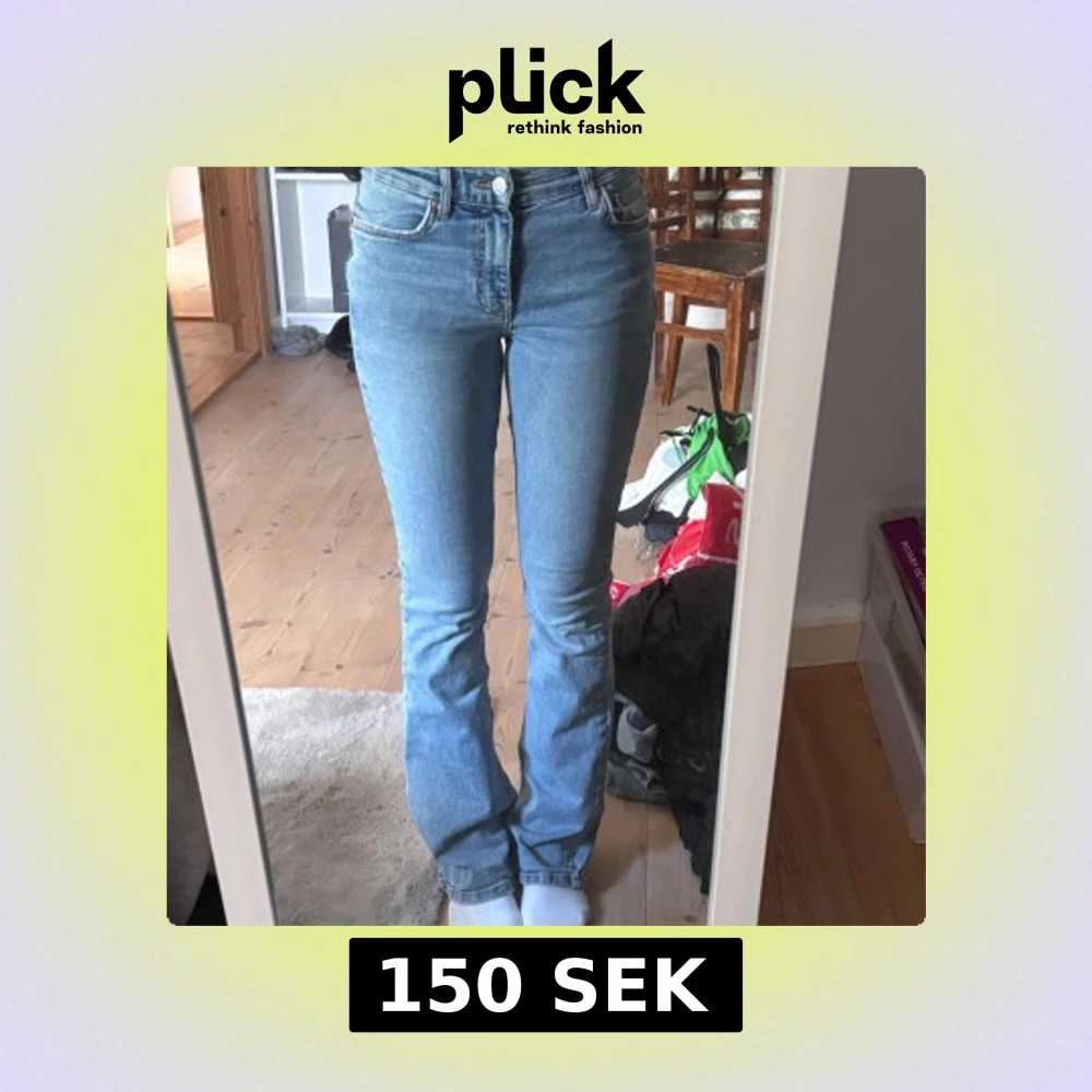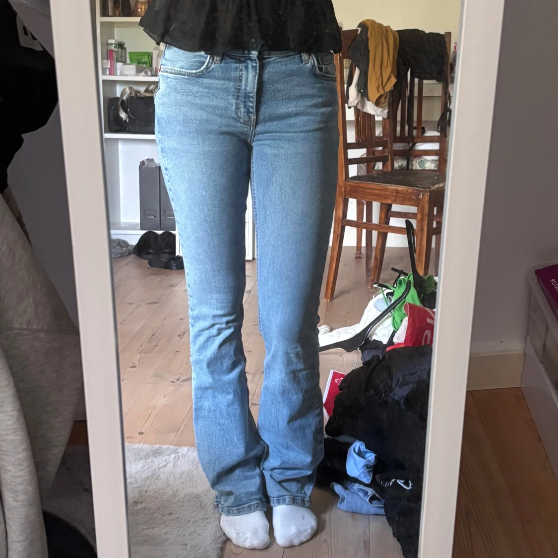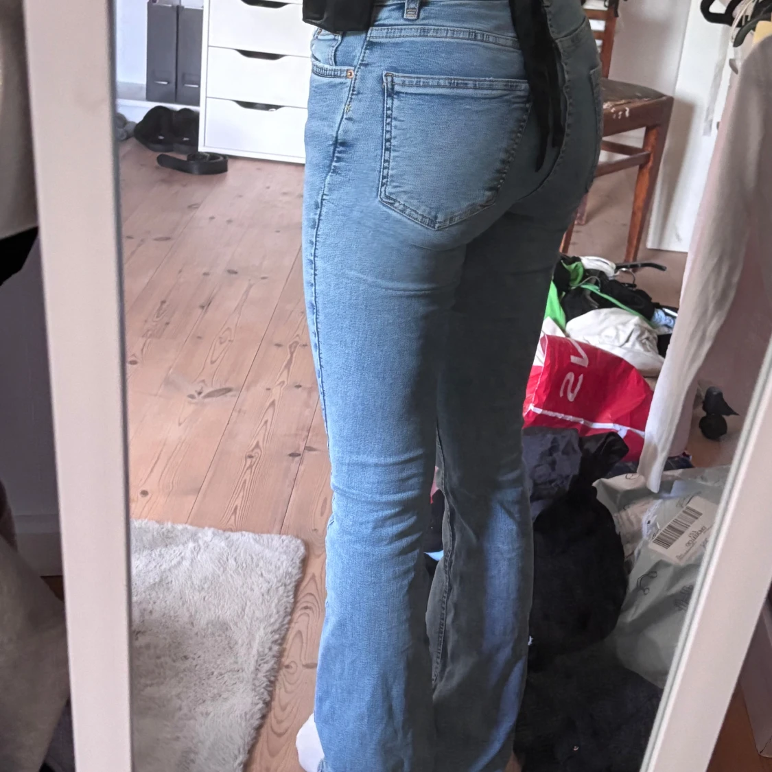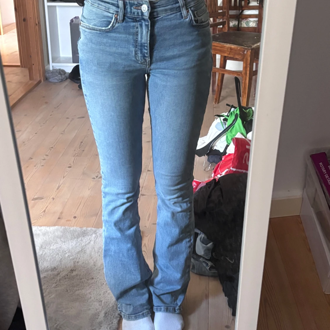Säljer ett par ljusblå Gina Tricot jeans med klassisk bootcut och hög midja. Jeansen har fem fickor, dragkedja och knapp framtill. Tillverkade i mjukt denimtyg som sitter snyggt och ger en tidlös look.