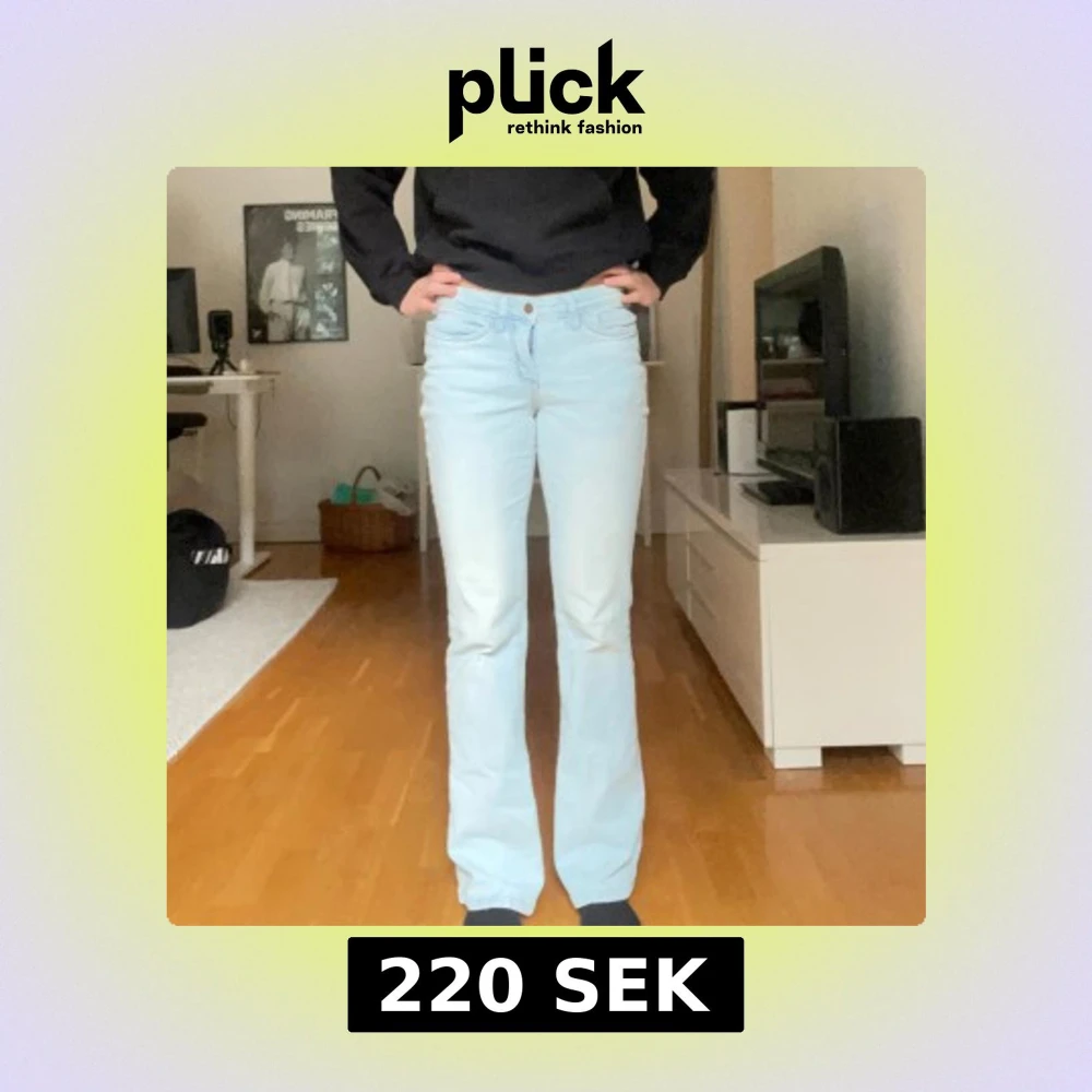 Snygga ljusblå jeans med bootcut passform och klassiska fem fickor. Jeansen har rosa detaljer.