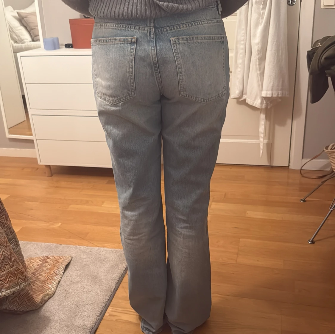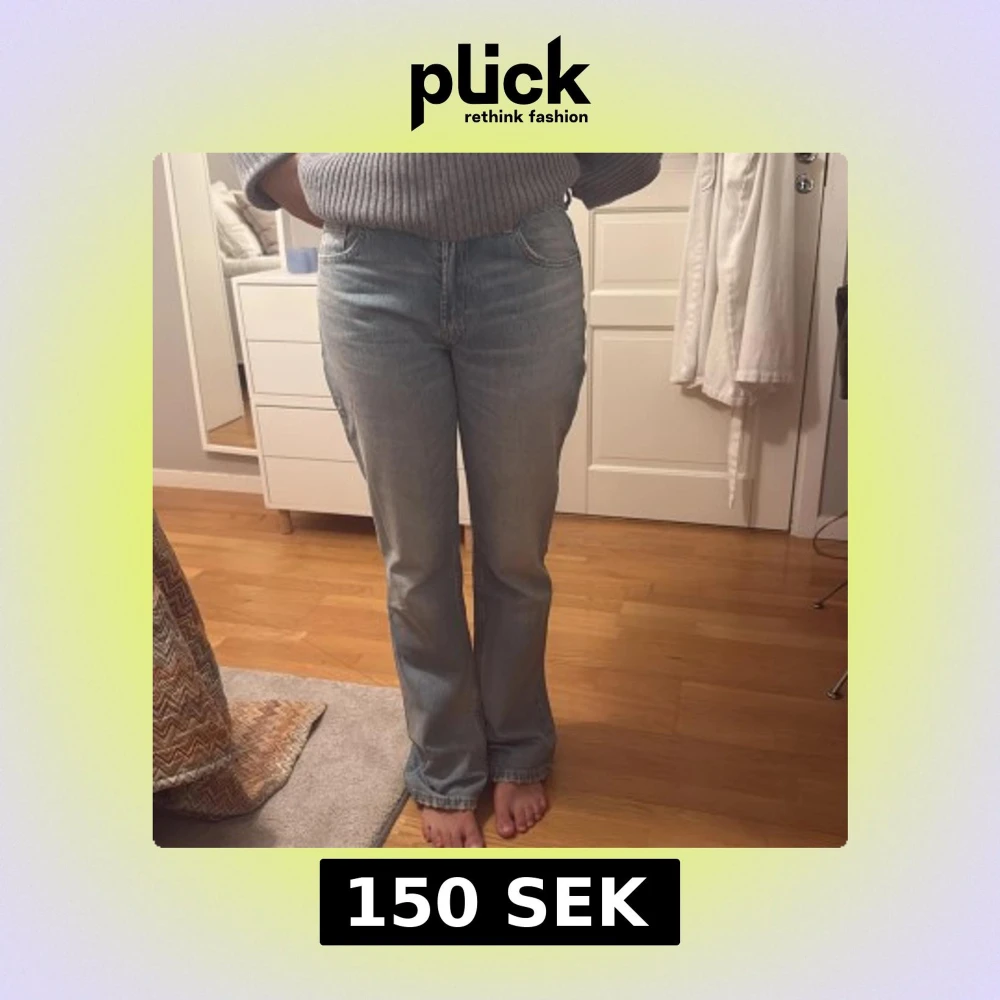 Säljer ett par ljusblå jeans med bootcut passform och klassiska fickor både fram och bak. Jeansen har normal passning och är perfekta för en avslappnad stil. Ingen stretch och traditionell jeanslook.