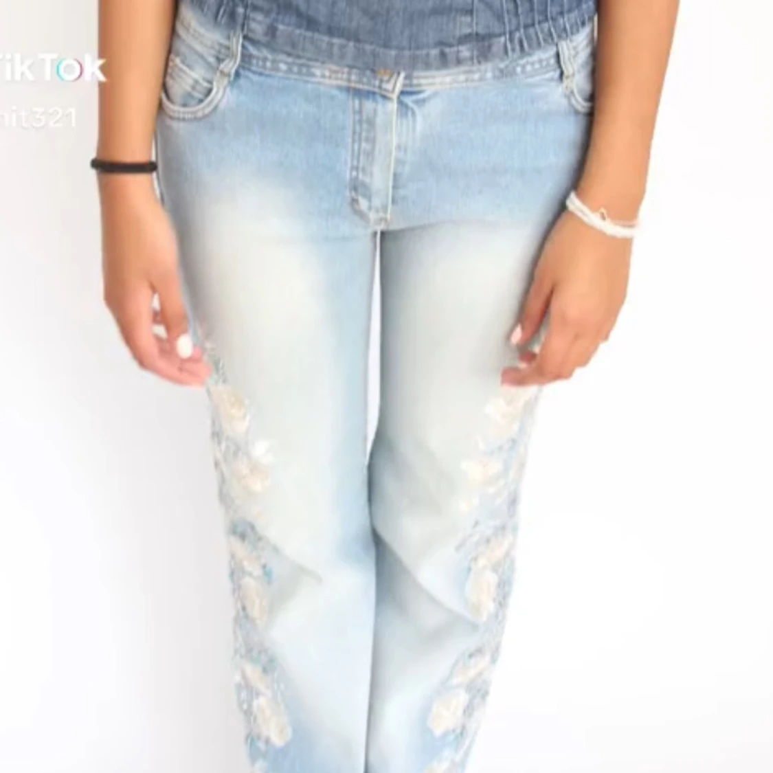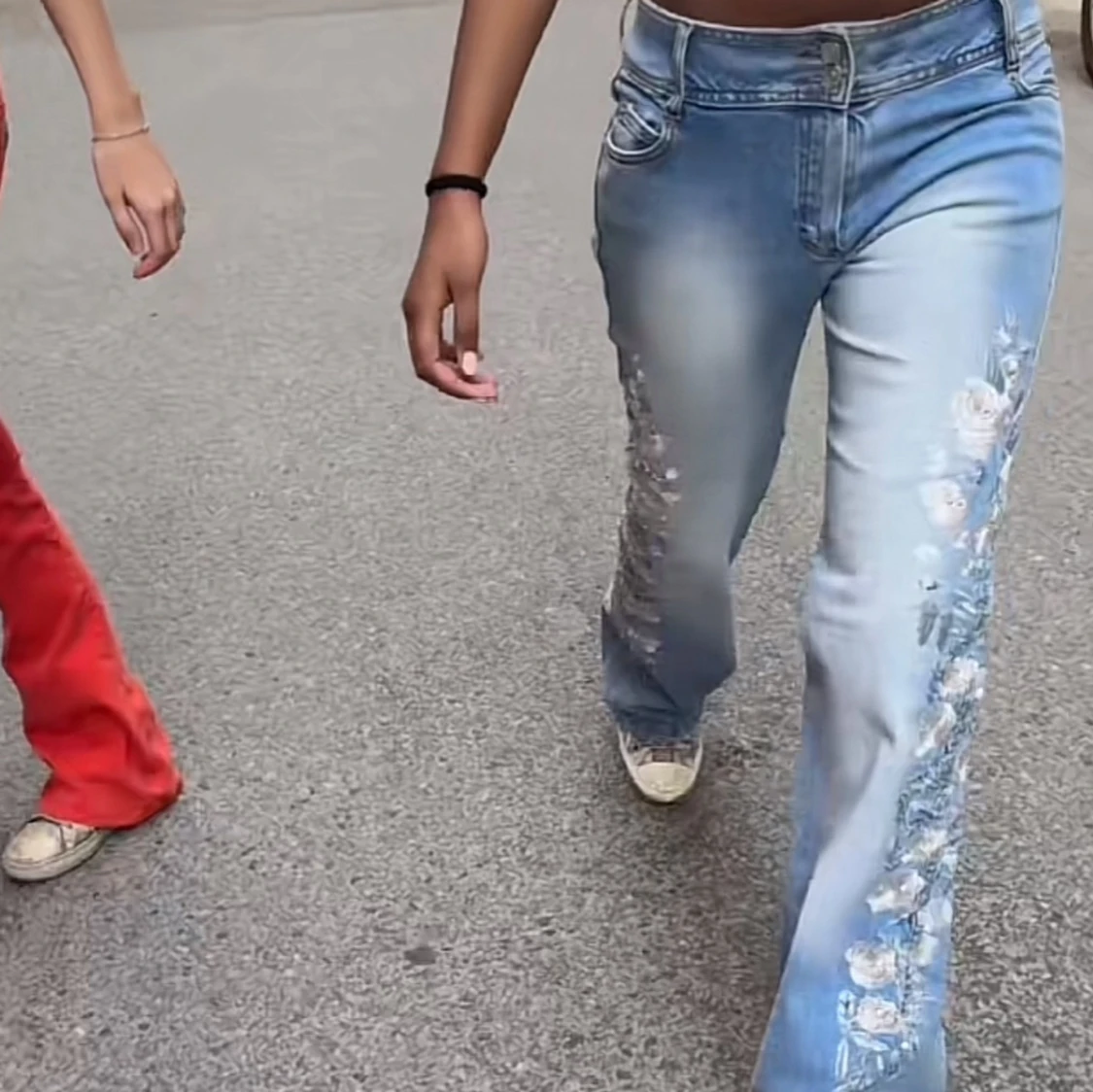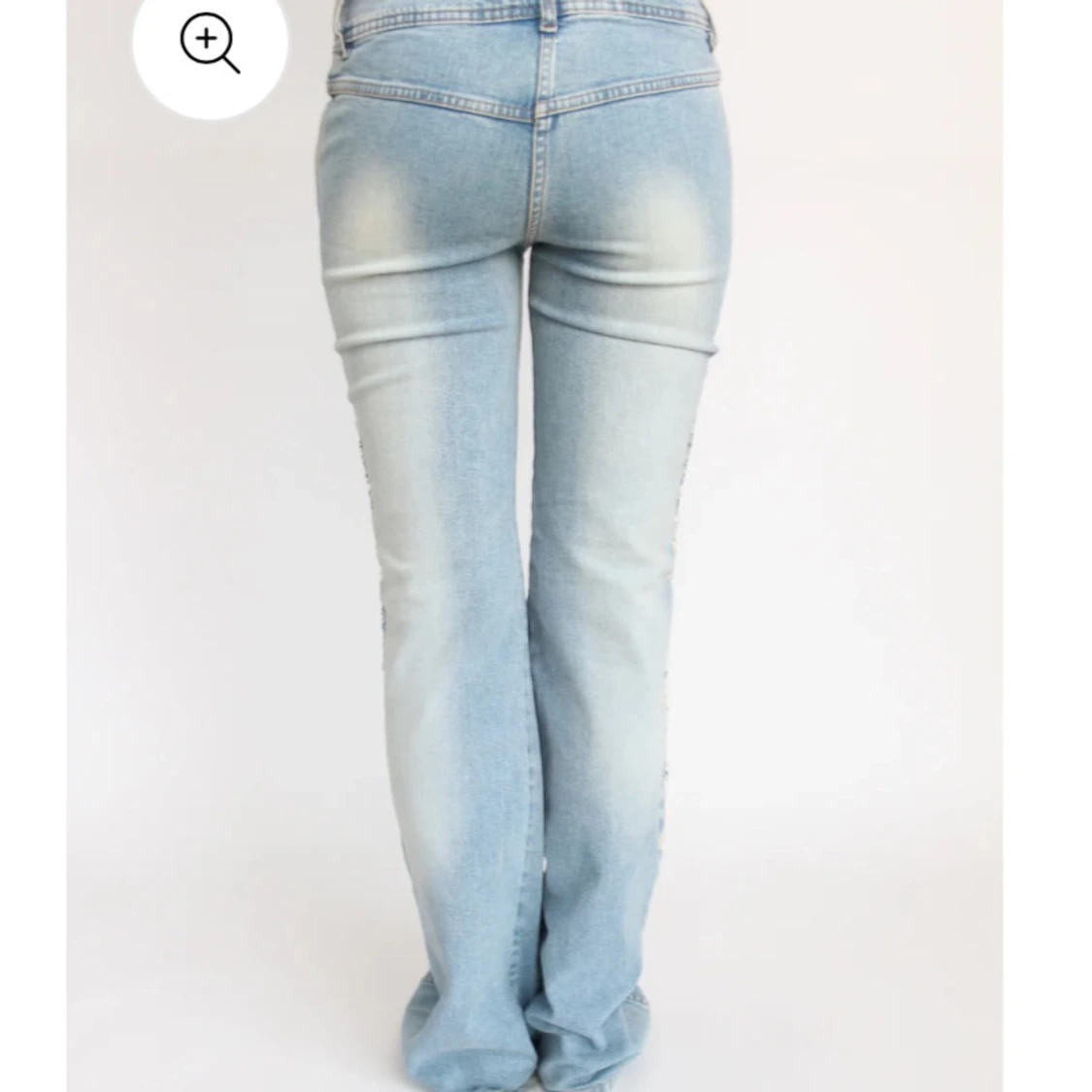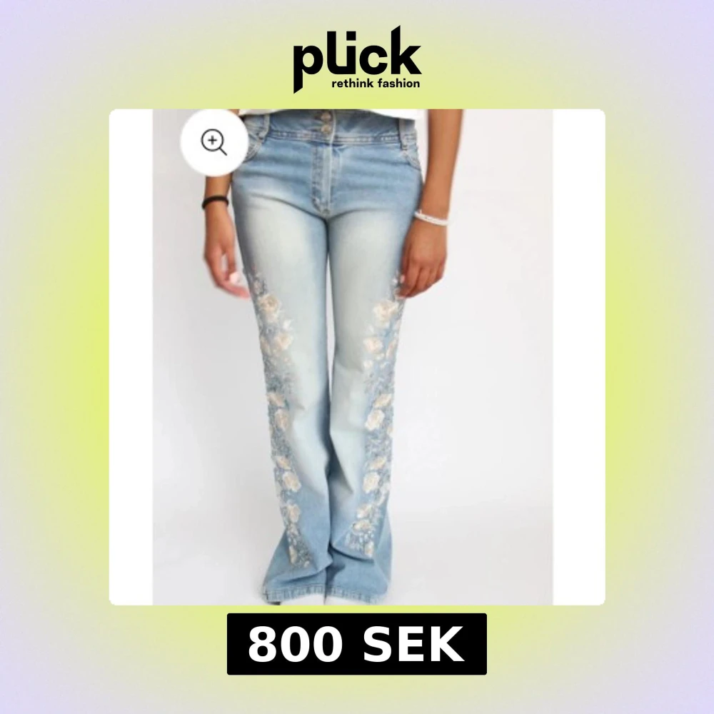 Säljer ett par ljusblå bootcut jeans med blommigt mönster längs benen. Dom är slitna längst ner så skickar bild på det privat. Jag är 173cm och dom sitter bra och lite långt på mig men dom går att klippa eller vicka upp eftersom blommönstret inte går hela vägen ner! Säljer bara vid bra pris eftersom det är så unika!🩵