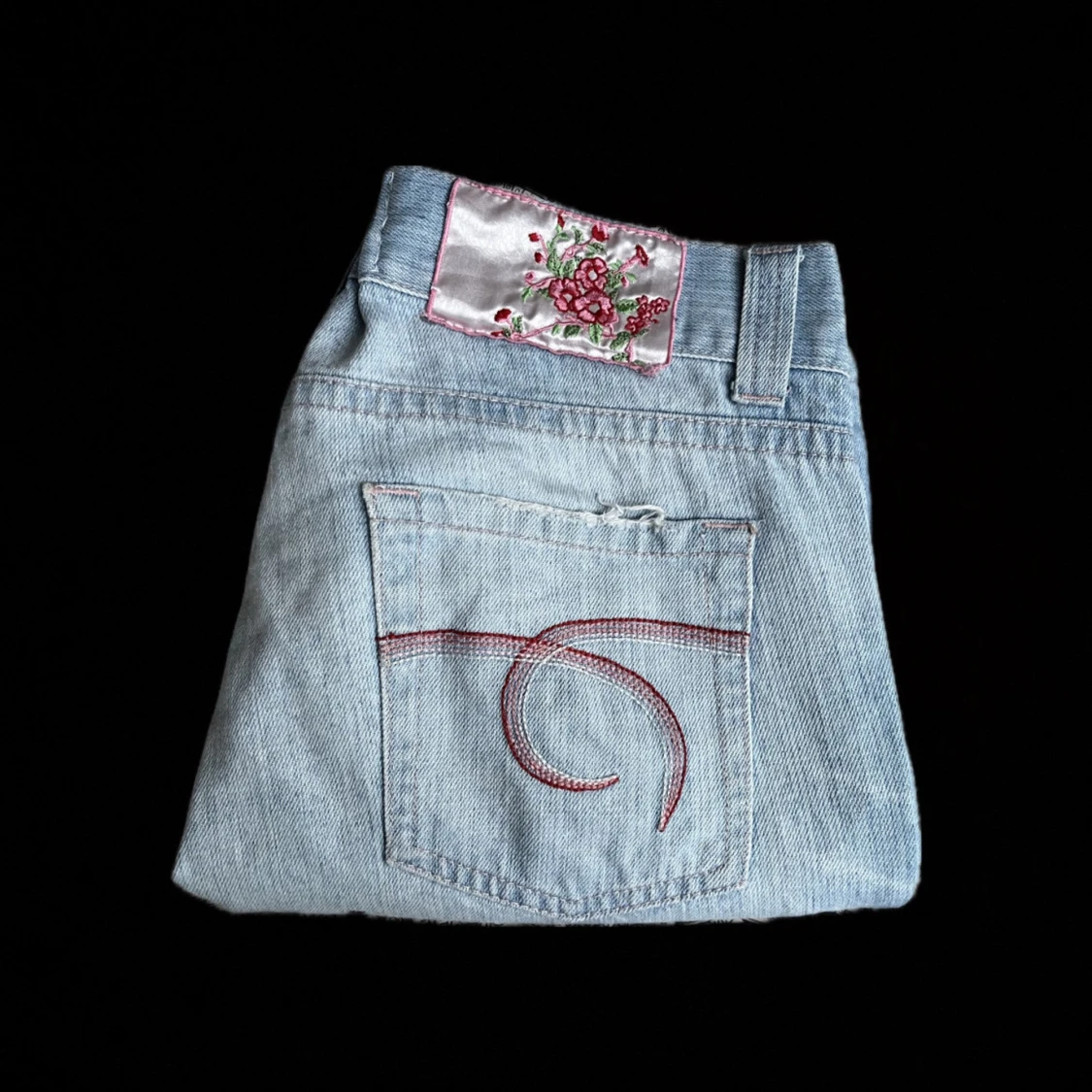 skit snygga lågmidjade ljusblå jeans med bootcut-stil. som man ser på bilden så har dom jätte fina bakfickor pluss någon blommig detalj. dom är köpte secondhand förra året men har tyvärr blivit för stora för mig så kommer inte till någon användning alls längre. lappen är bortklippt pga obehag, storleken är 36 men sitter snarare lite mer som 38. från originalet så är jeansen från Gina tricot. priset går alltid att diskuteras!