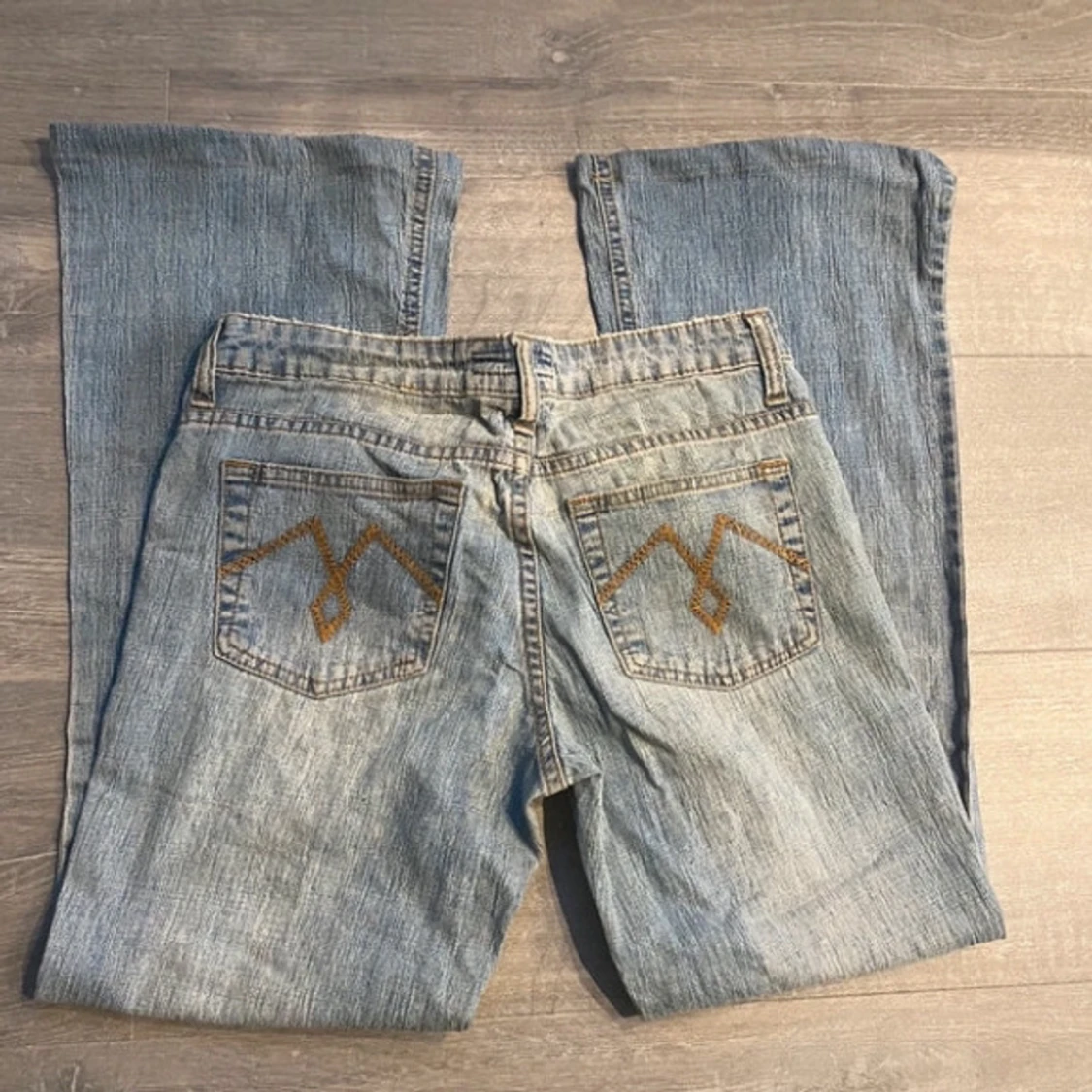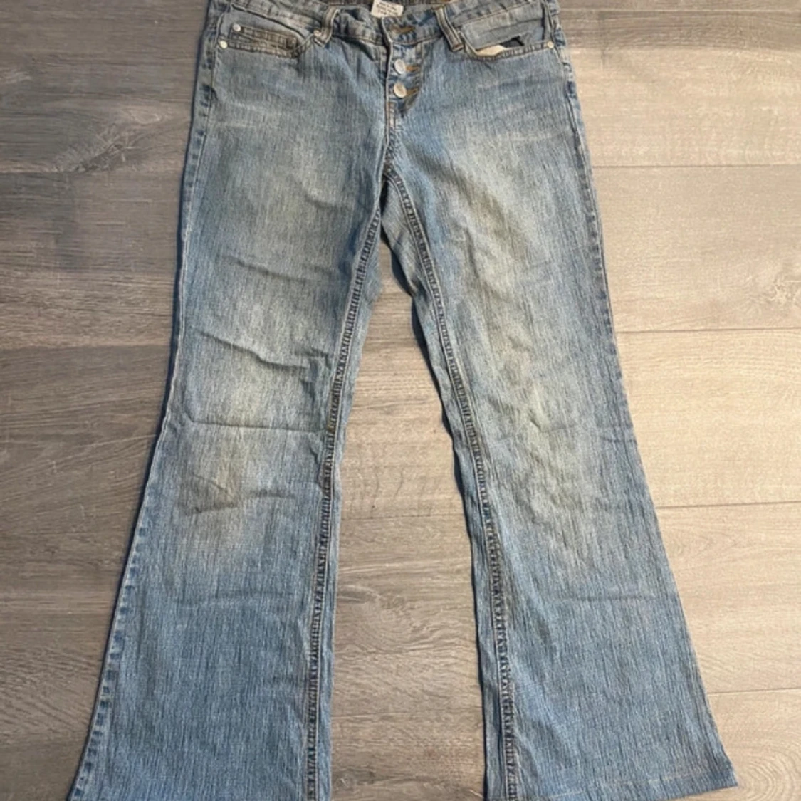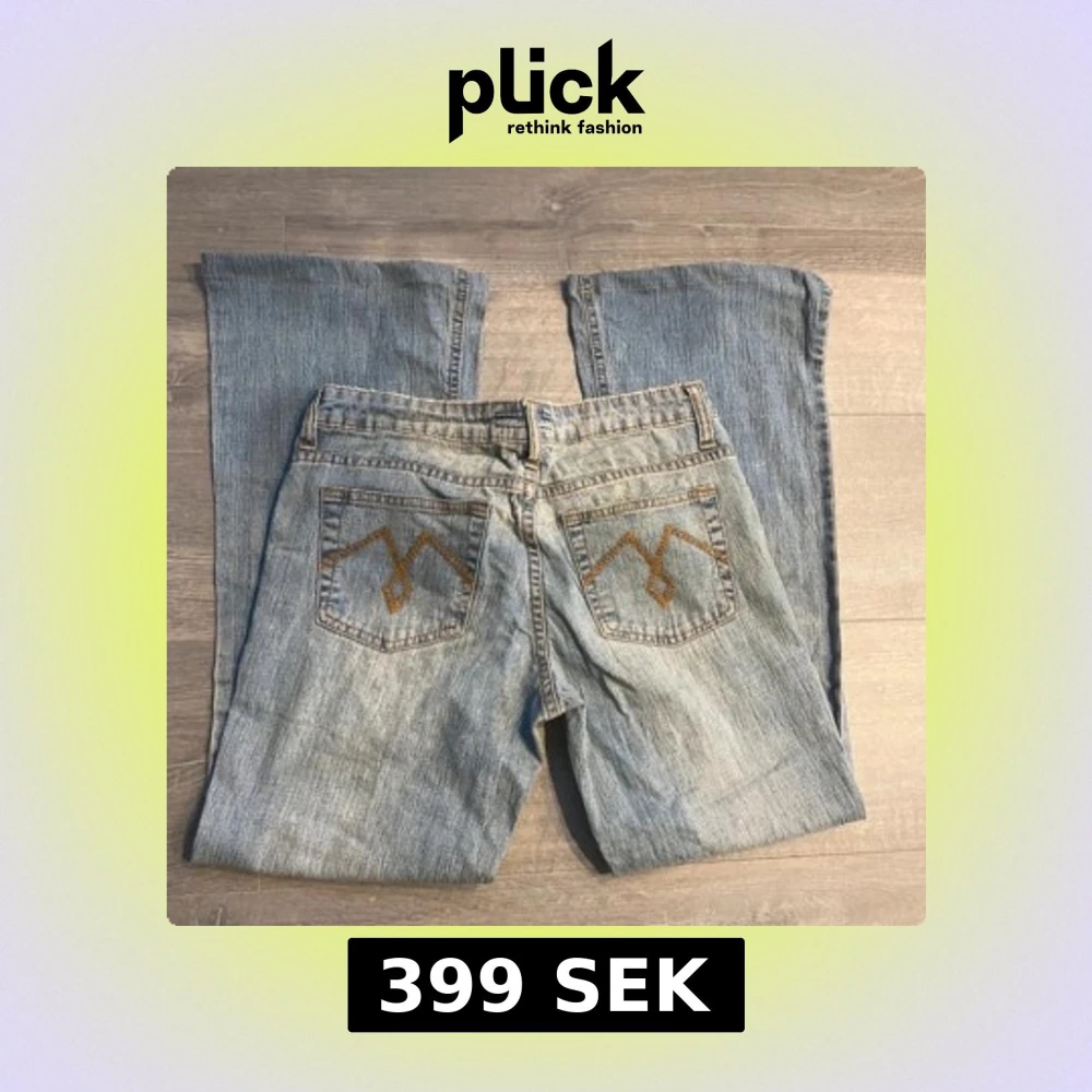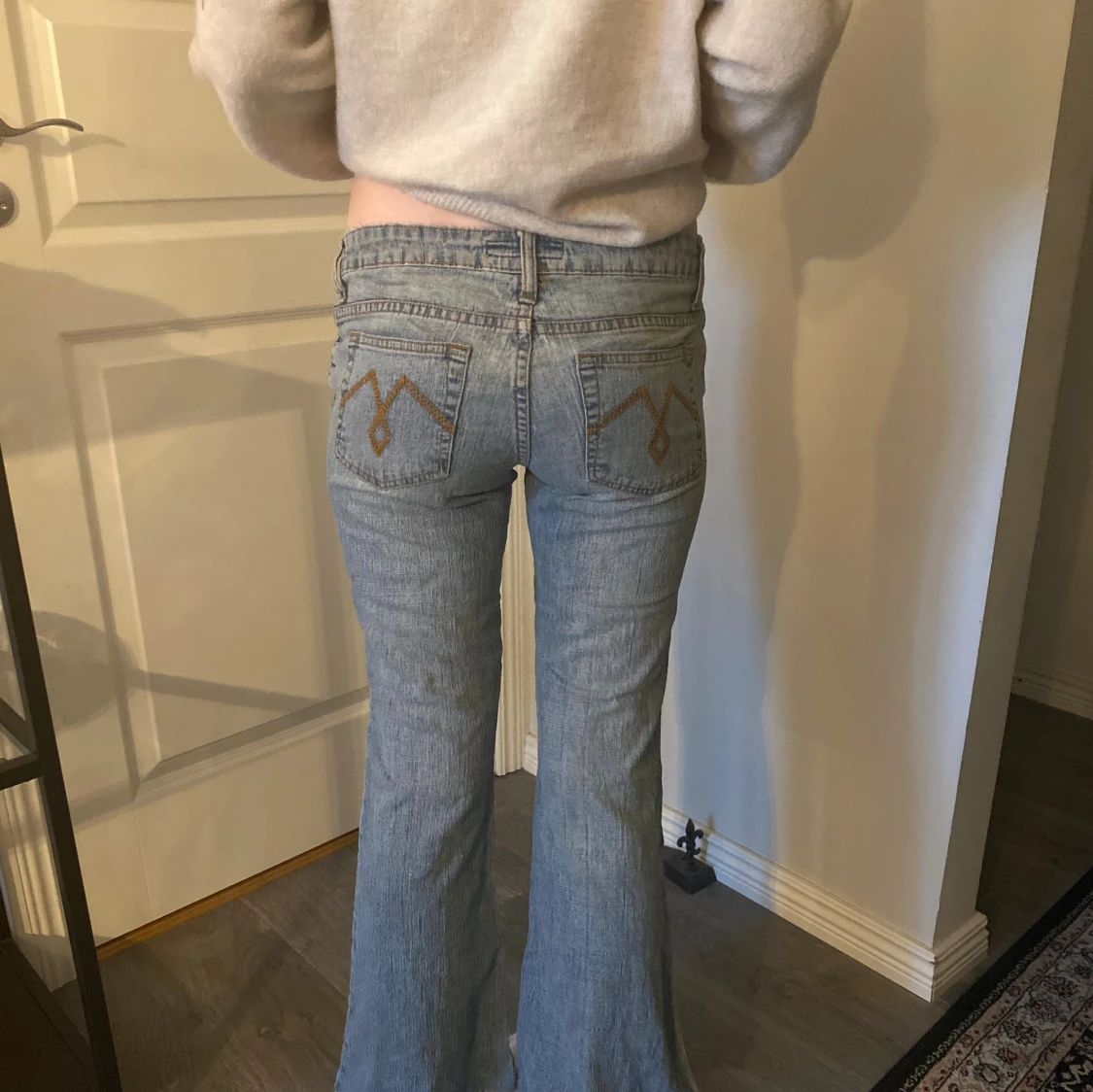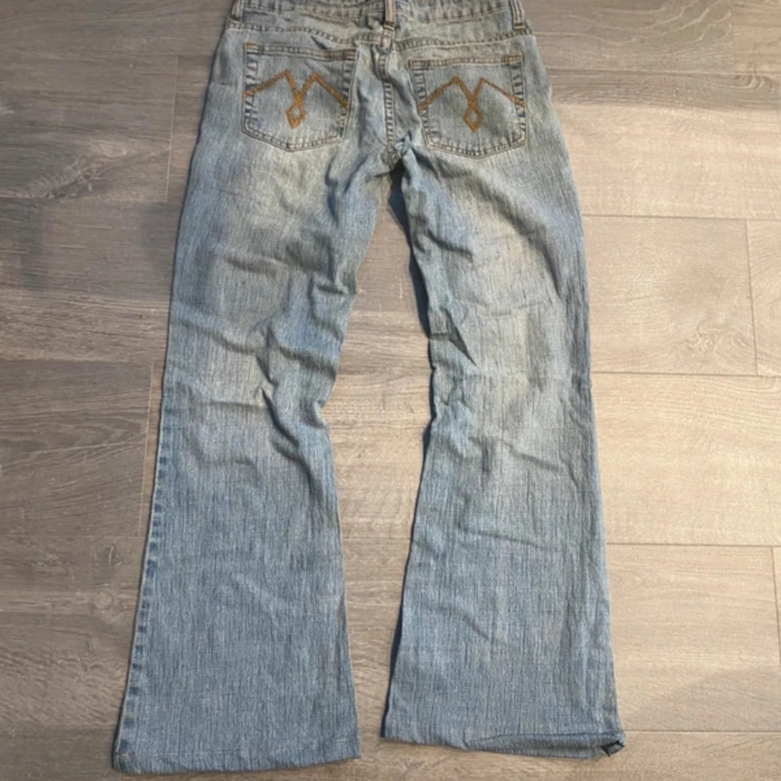 Säljer ett par ljusblå jeans med bootcut passform och snyggt brunt broderi på bakfickorna. Jeansens mått : midjemått 37 cm tvärs över, innerbenslängd 71 cm, benöppning 25 cm