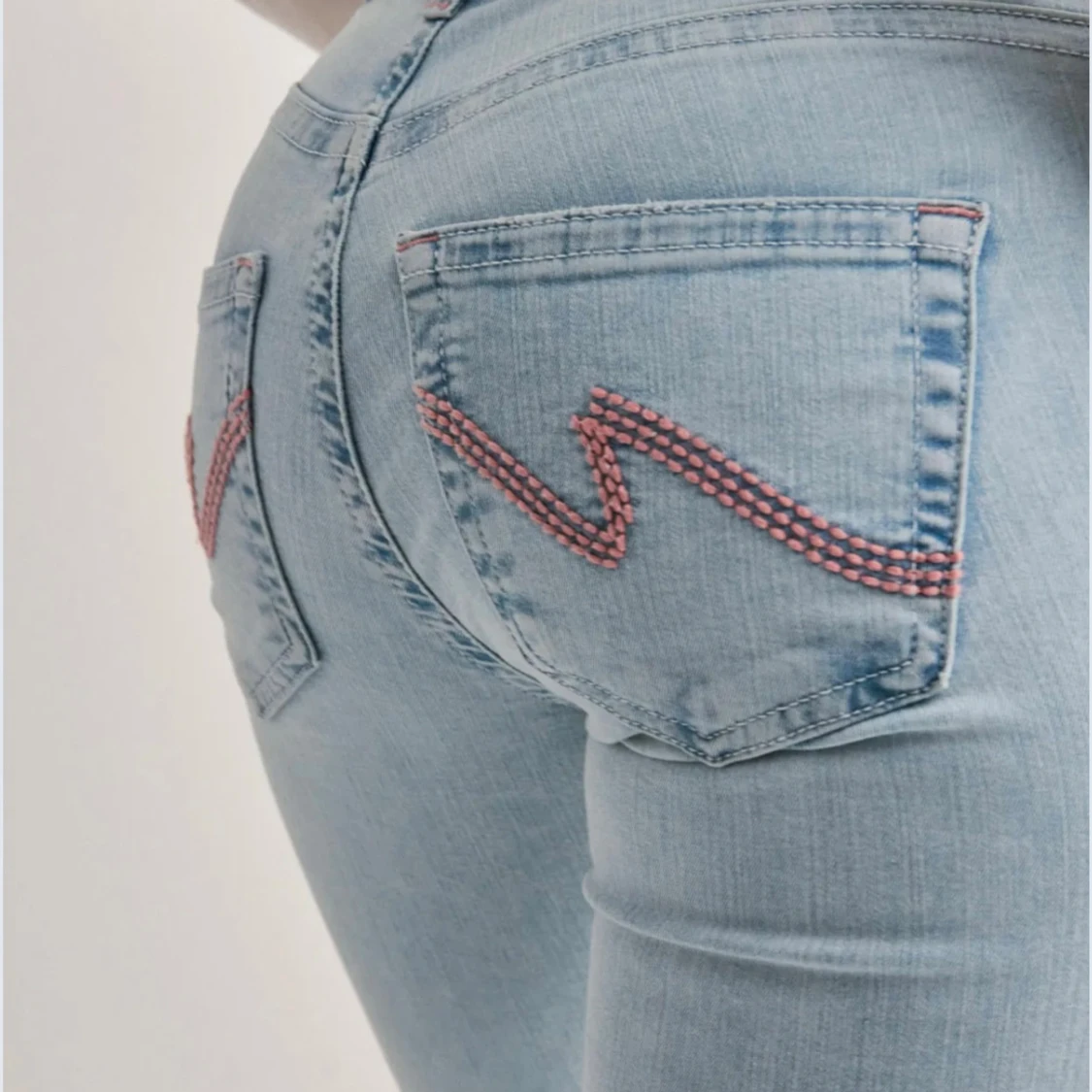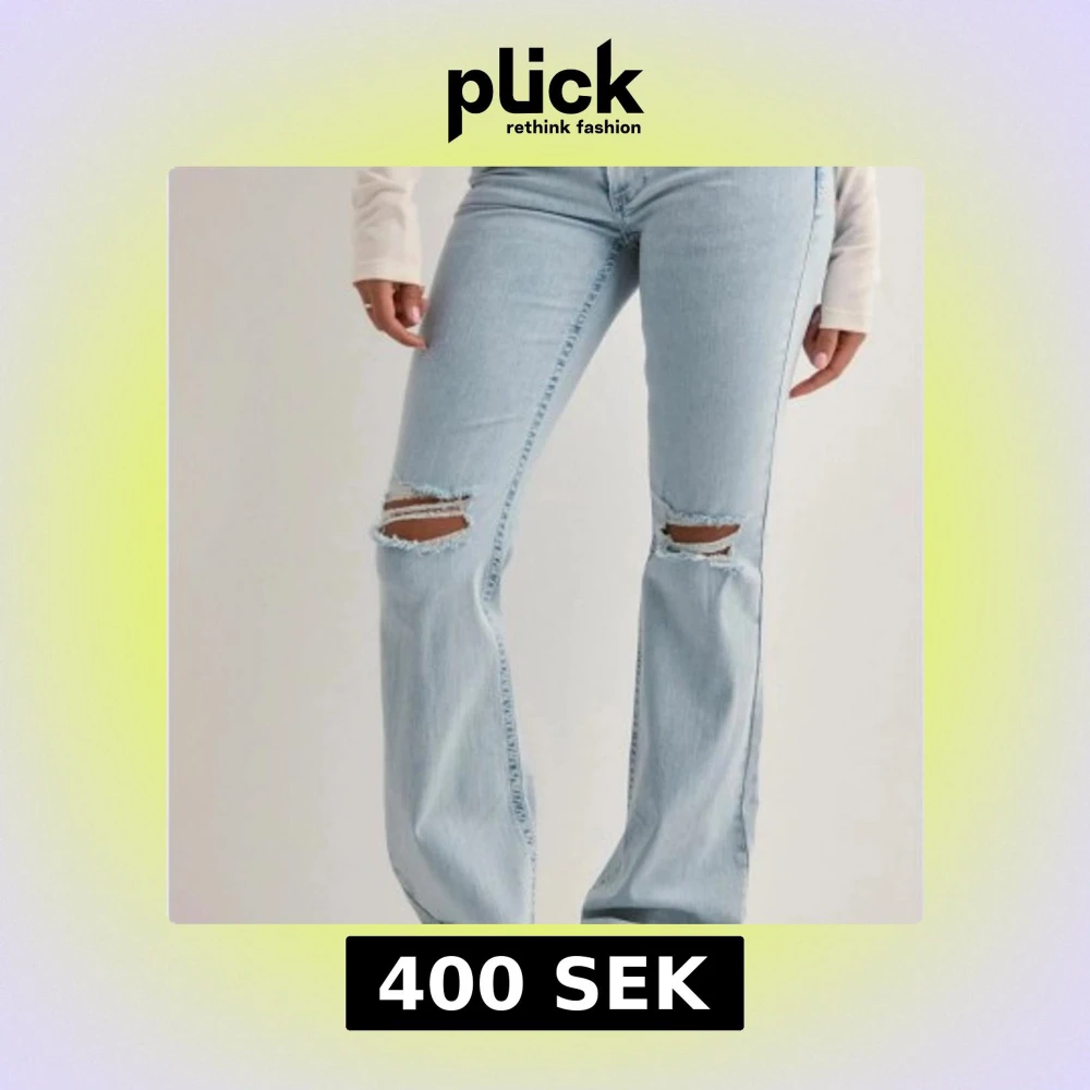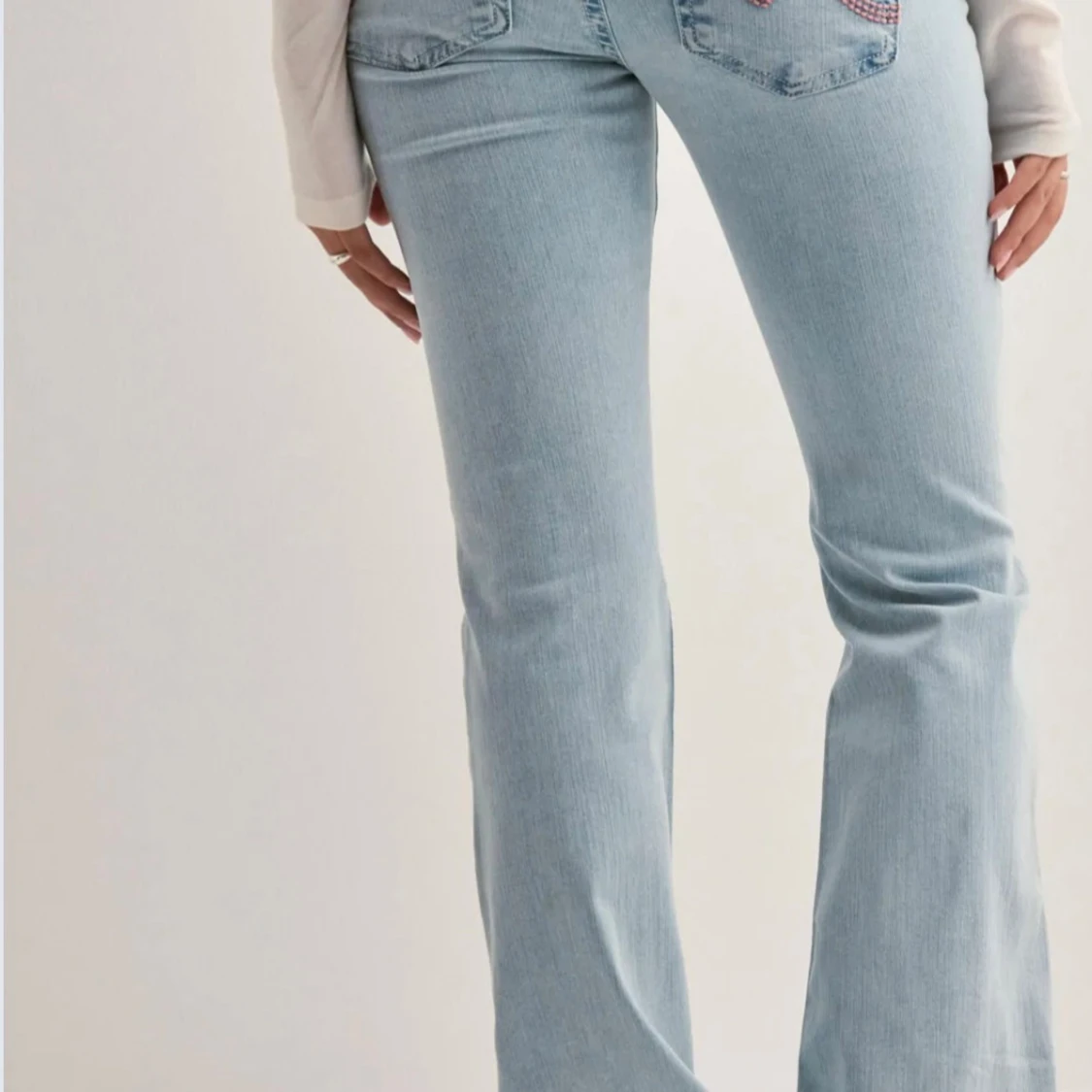 Snygga ljusblå jeans med bootcut passform och slitna hål på knäna. Bakfickorna har coolt rosa broderi som ger extra edge. Jeansen är i klassisk denim och har en hög midja för en trendig siluett.
