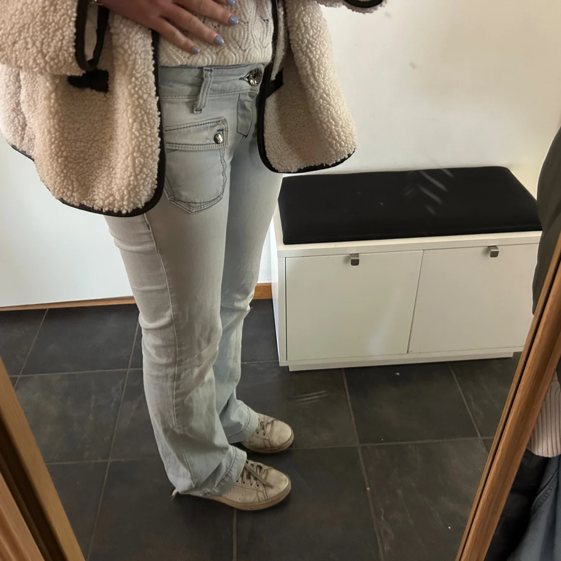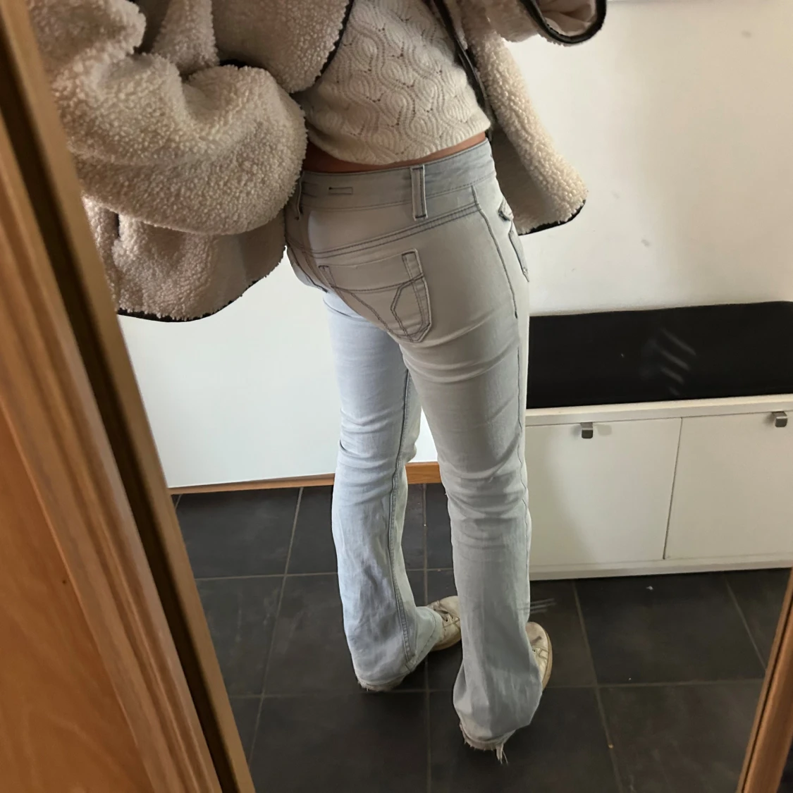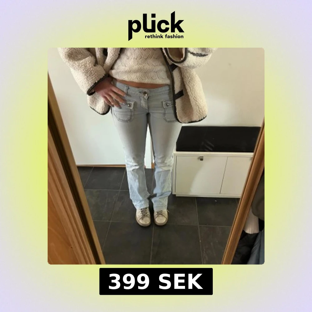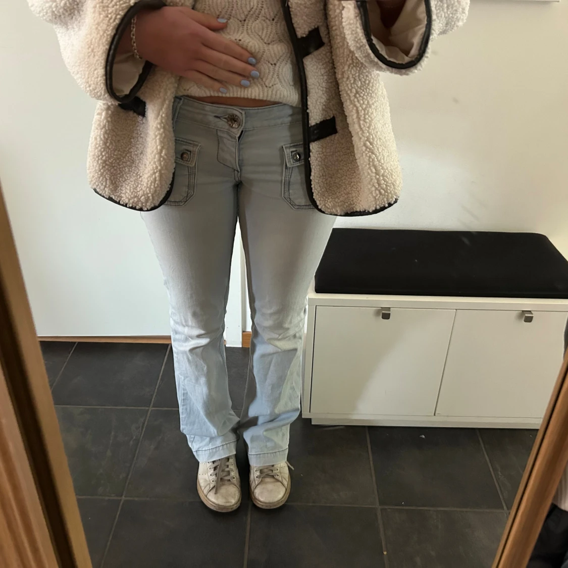 Säljer ett par ljusblå jeans med låg midja och bootcut-ben. Jeansen har stora fickor framtill med lock och knappar, samt klassiska bakfickor. Snygga kontrastsömmar och coola detaljer som ger en trendig look. Perfekta för dig som gillar 00-talsvibbar.