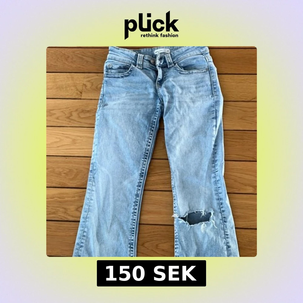Säljer ett par ljusblå jeans med bootcut passform och snyggt sliten look. Jeansen har ett stort hål på ena benet och coola bakfickor med lock och knapp. Perfekta för dig som gillar en avslappnad och trendig stil. Hålet har jag gjort själv.