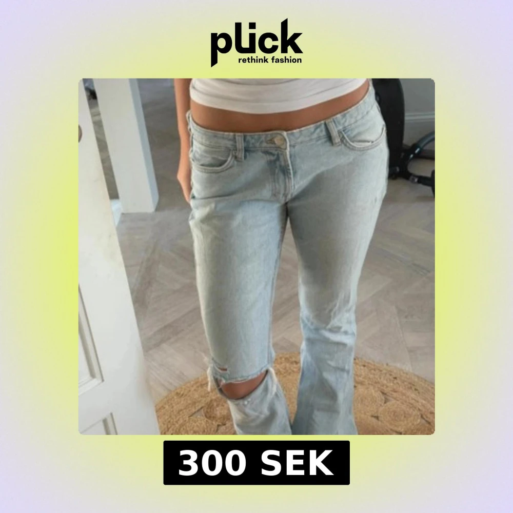 Säljer ett par ljusblå jeans med bootcut-modell och låg midja. Jeansen har ett hål vid ena knät för en cool, avslappnad look. Klassisk femficksdesign och tillverkade i jeansmaterial. Perfekta för dig som gillar en trendig och avslappnad stil.