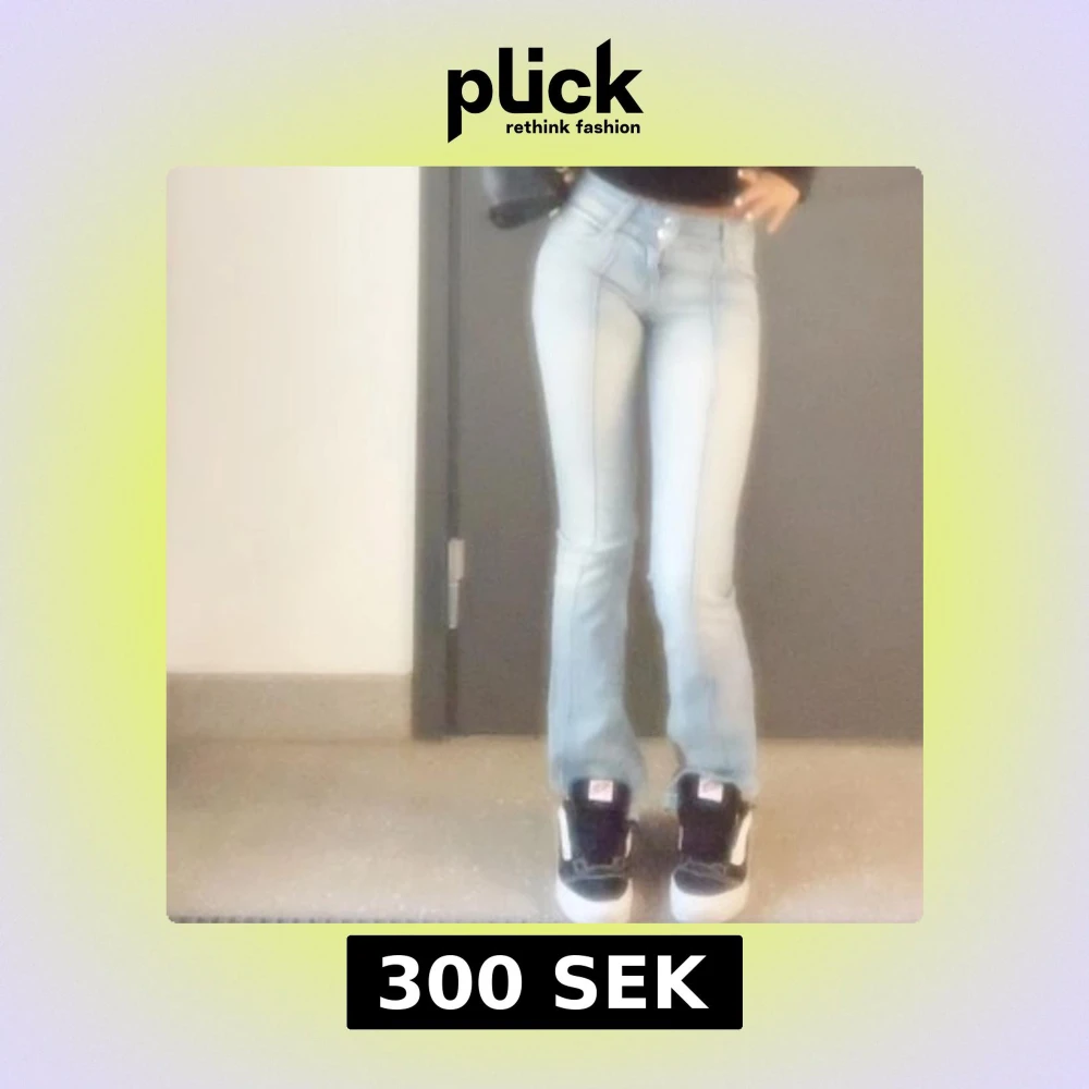 Säljer ett par ljusblå jeans med bootcut och hög midja. Jeansen har markerade sömmar framtill och klassisk femficksdesign. Snygg passform som framhäver benen och ger en retrovibe. Perfekta till sneakers eller boots. Lite slitningar, kan skicka bild på de privat