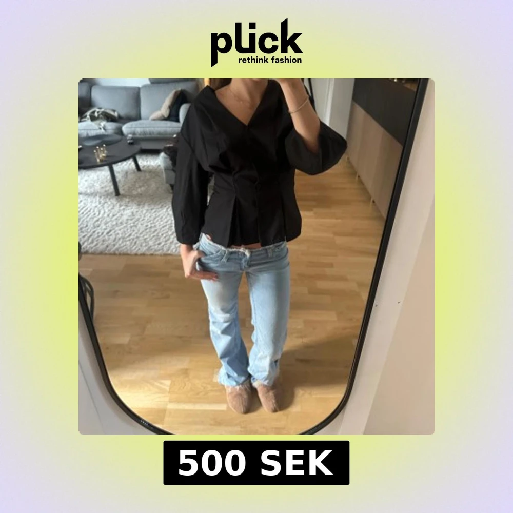 Säljer ett par super snygga ljusblå jeans med bootcut och låg midja🤩 Jeansen har klassisk femficksdesign, dragkedja och knapp framtill samt rå kant upptill. Materialet är jeans och passformen är loose med utsvängda ben