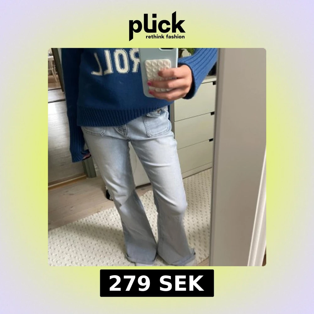 Säljer ett par ljusblå jeans med bootcut och låg midja. Jeansen har stora framfickor och klassisk femficksdesign. De är tillverkade i mjukt denim och har en avslappnad, lite retro vibe. Perfekta för dig som gillar en chill och trendig look.