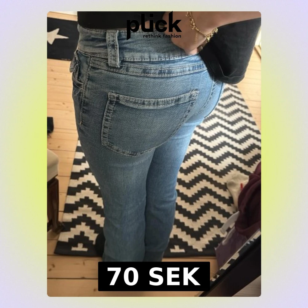Säljer ett par ljusblå jeans med bootcut passform och låg midja. Jeansen har klassiska fickor både fram och bak, dubbla knappar i linningen och är tillverkade i mjukt denimtyg. Perfekta för en avslappnad och trendig look.