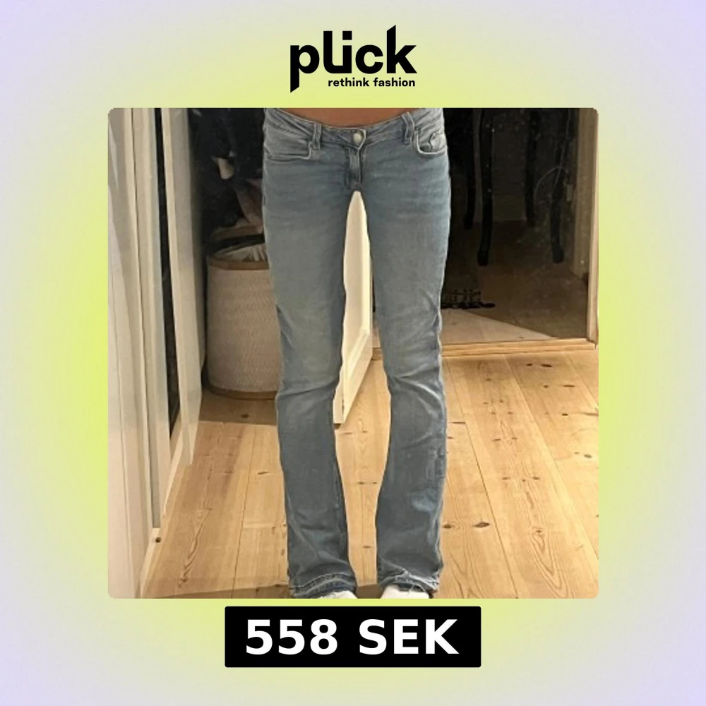 Säljer ett par ljusblå jeans med bootcut. Jeansen har klassisk femficksdesign, dragkedja och omsydda till låg midja. Innerbenslängd: ca 80cm & midjemåttet rakt över: ca 34cm