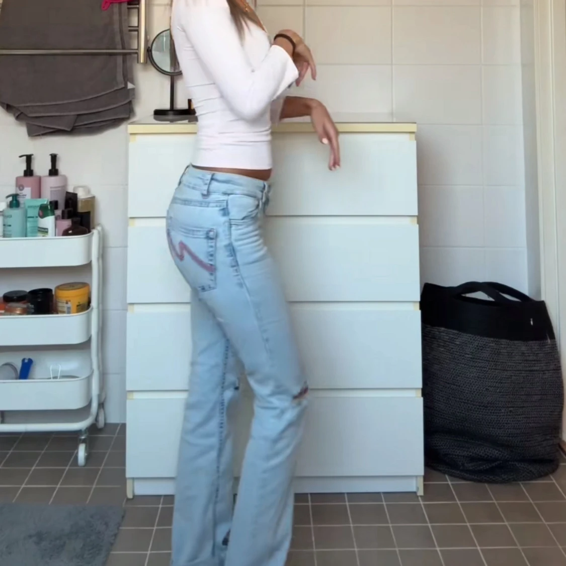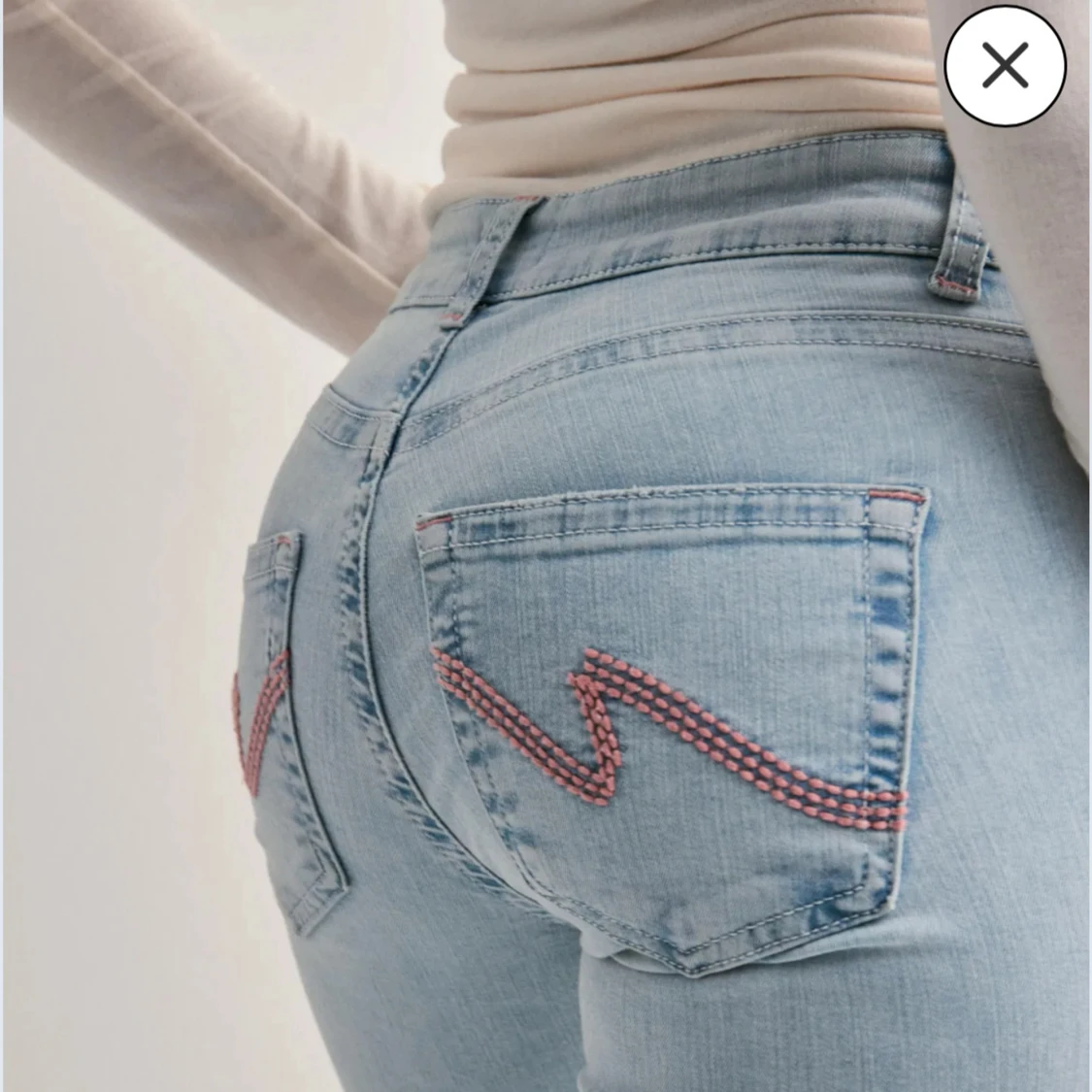 Säljer ett par ljusblå bootcut jeans med låg midja och rosa broderade detaljer på bakfickorna. Nästan aldrig använt 💗köpte för 700