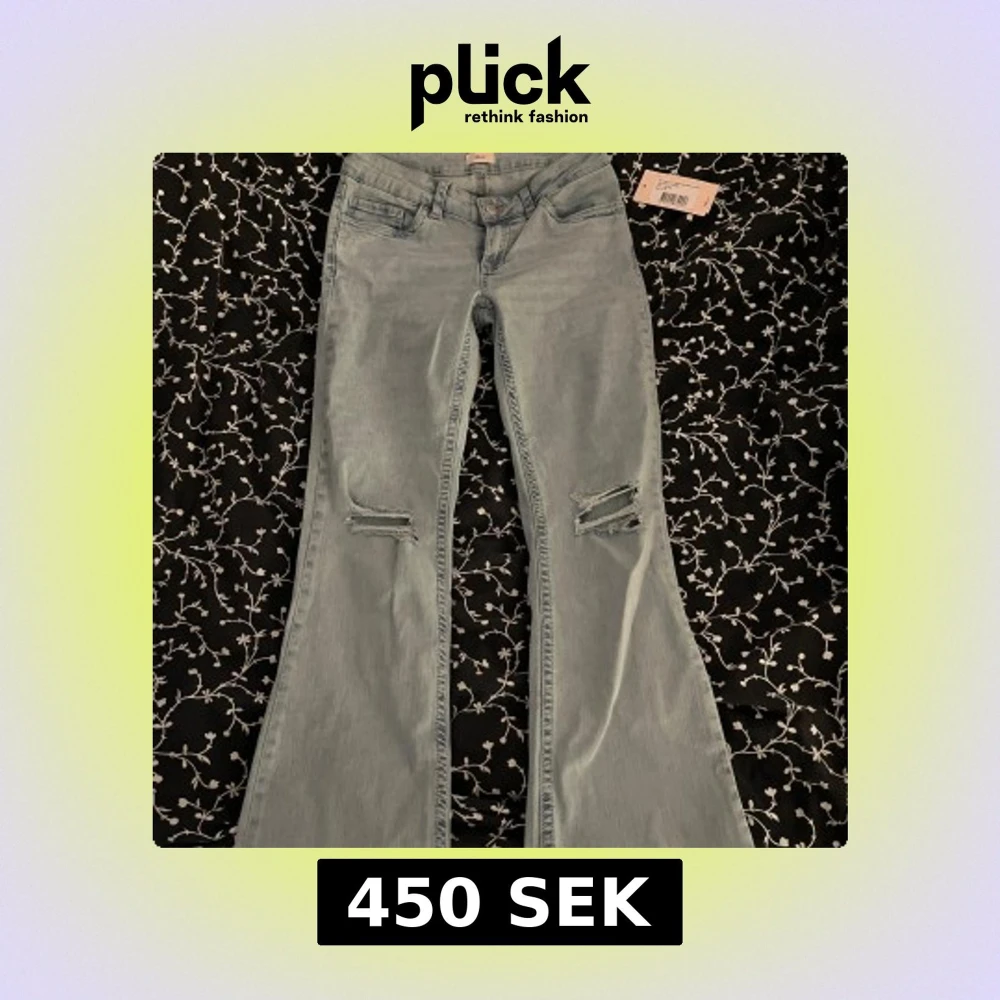 Snygga ljusblå bootcut jeans med slitningar på knäna och broderad detalj på bakfickan. Aldrig använda, helt nytt skick.