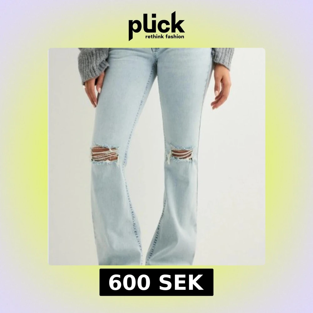 Snygga ljusblå jeans med bootcut passform och slitna detaljer vid knäna. Jeansen har klassisk femficksdesign och bakfickor med rosavitt broderat mönster. Storlek 36, använd väldigt sparsamt då dom inte passar mig och kommer inte till användning köpt för 699kr