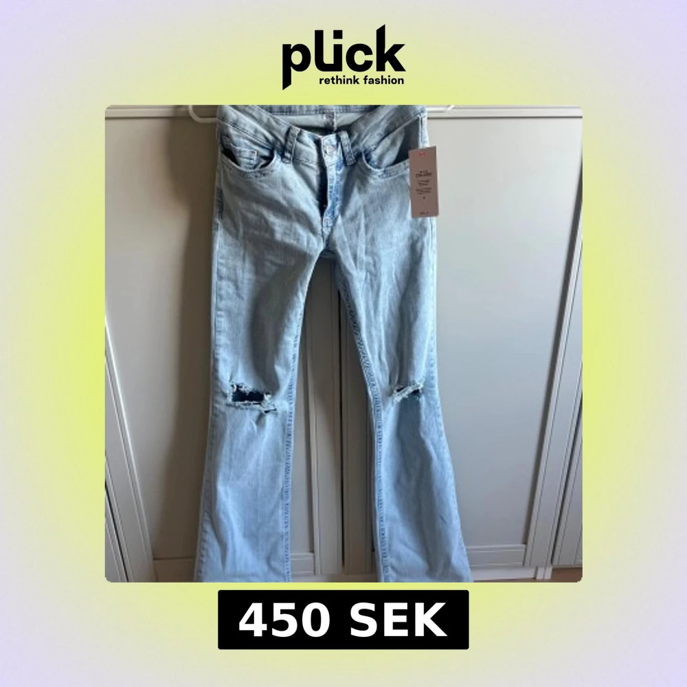 Snygga ljusblå jeans från Nelly med bootcut och slitna hål över knäna💖pris kan diskuteras