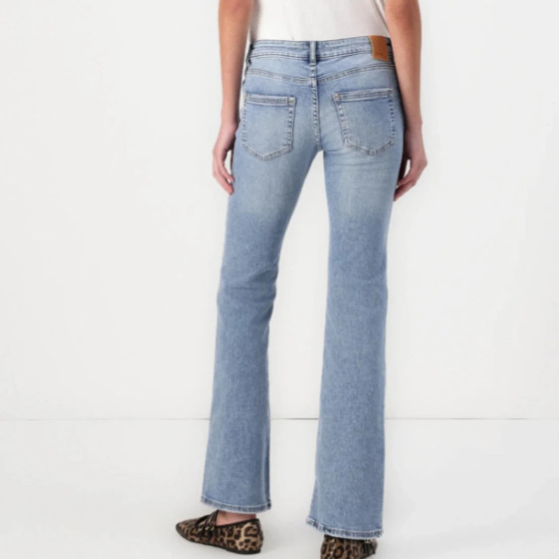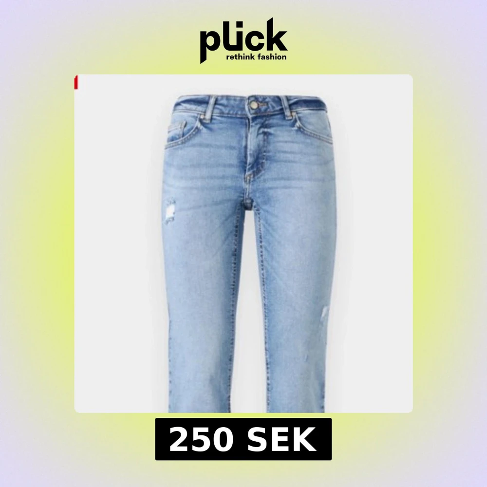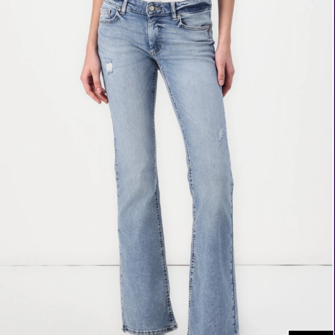 Snygga ljusblå jeans med bootcut passform och diskreta slitningar på låret och knät. Klassisk femficksmodell med bälteshällor och dragkedjegylf. Jeansen har en lätt tvättad look och är perfekta för en avslappnad stil. Storleken är S34