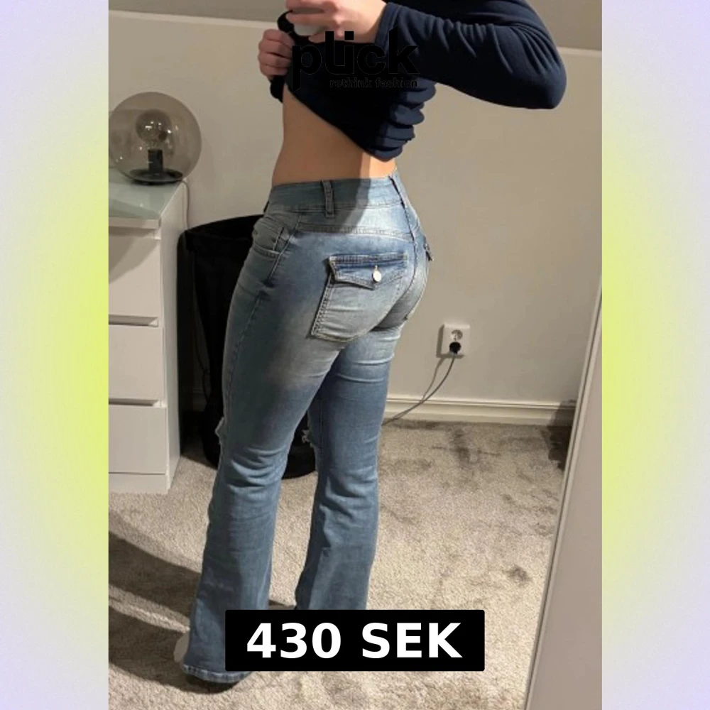Säljer ett par ljusblå jeans med bootcut passform och låg midja. Jeansen har slitna hål på båda knäna och snygga detaljer på bakfickorna med knappstängning. Materialet är klassisk denim och de har en cool, avslappnad vibe.