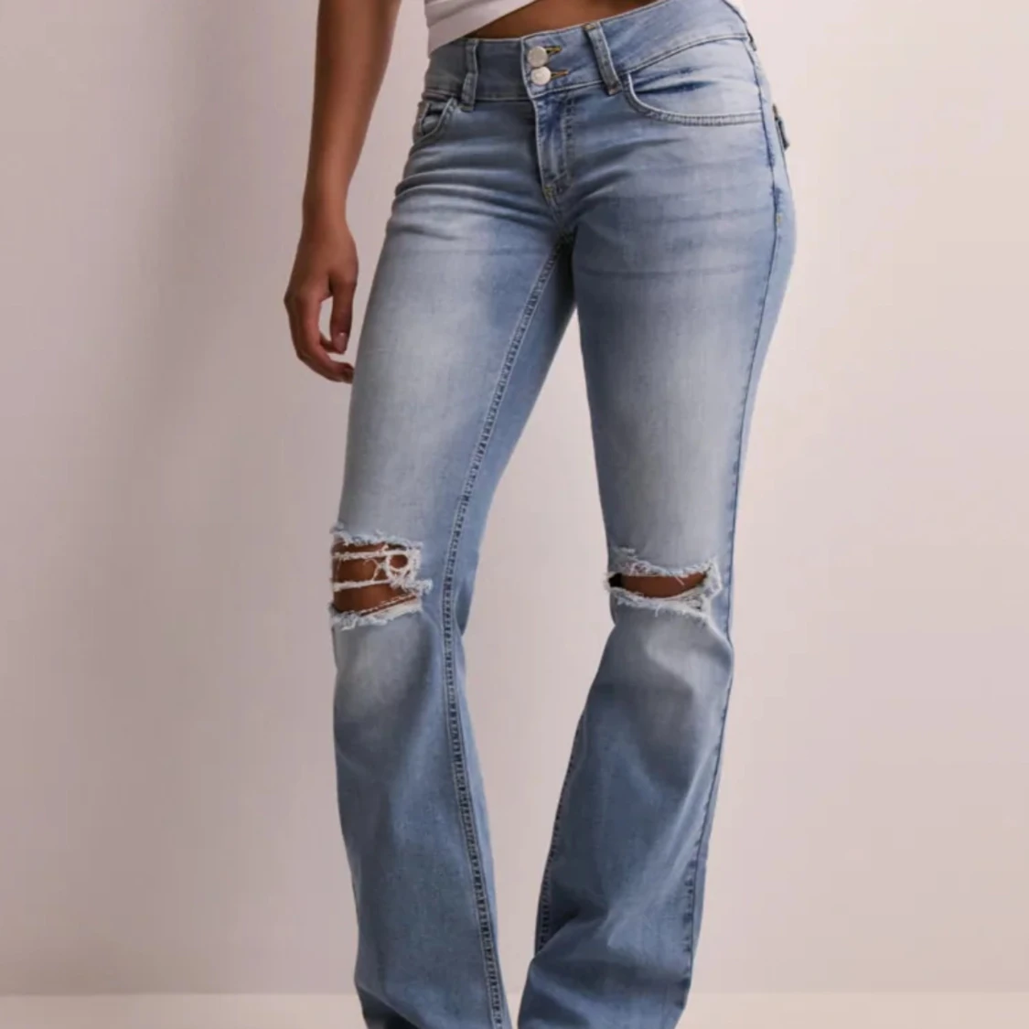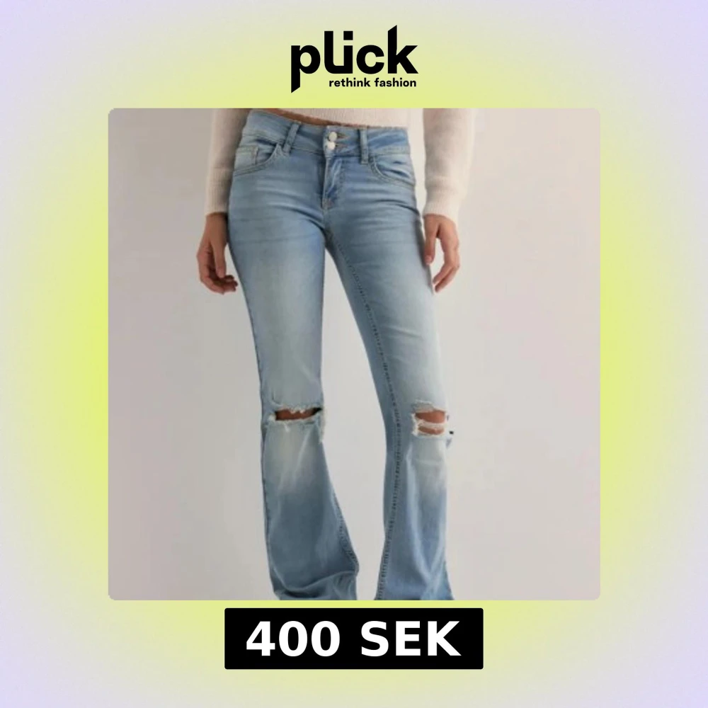 Snygga ljusblå bootcut jeans med slitningar vid knäna. Knappt använda. Nypris 700 från Nelly