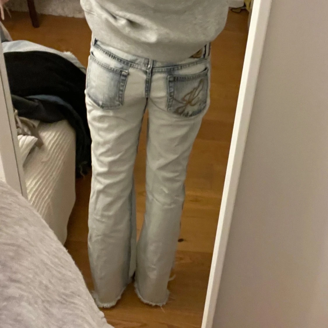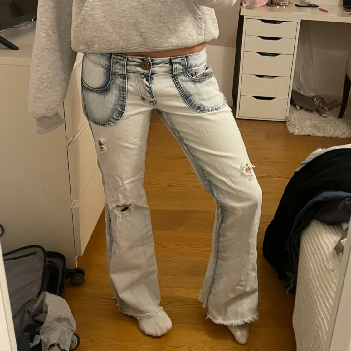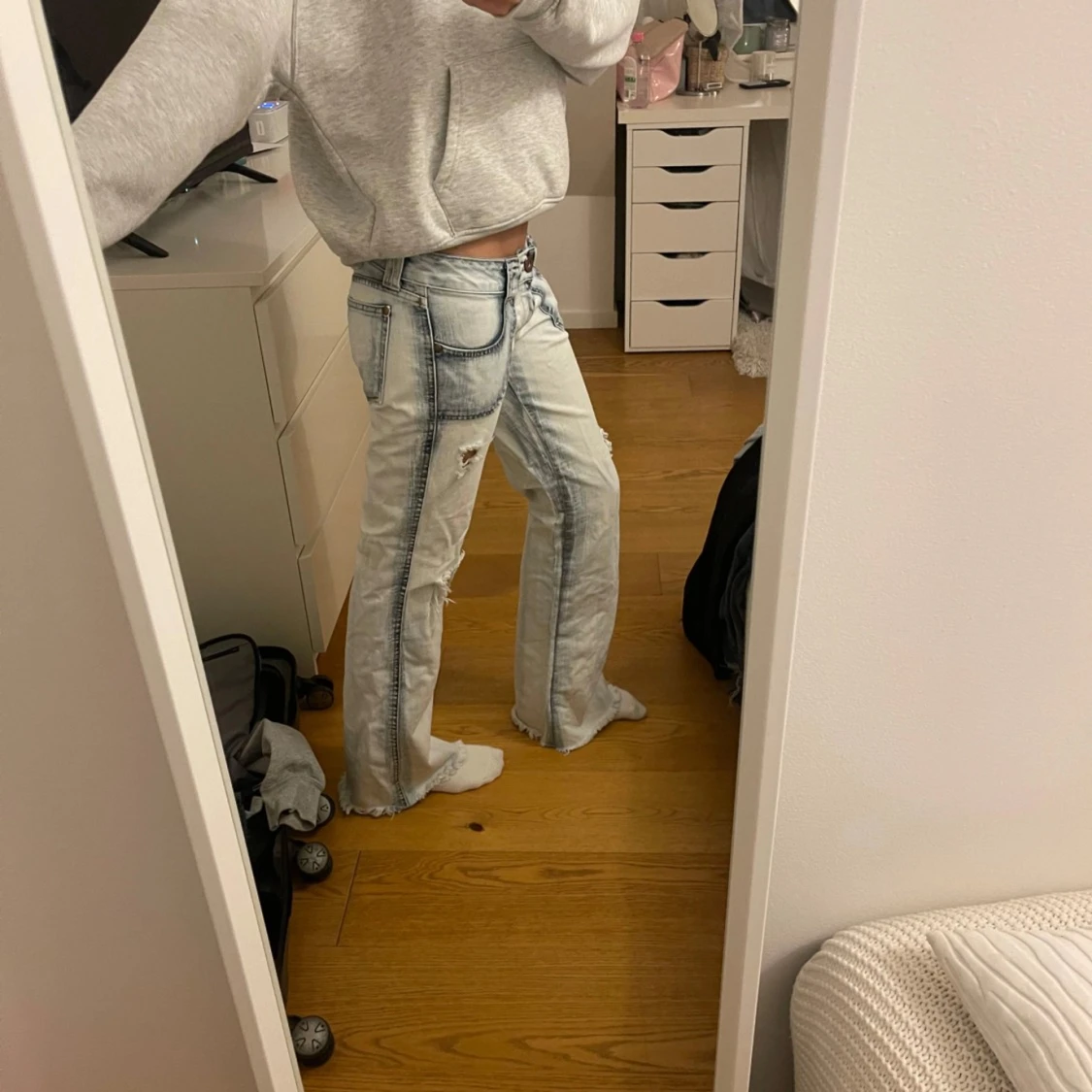 Säljer ett par ljusblå bootcut jeans med slitningar på benen och markerade kontrastsömmar. Jeansen har stora fickor fram och bak. Jättesnygga och passar mig som är 160-165 och har xs/s. Innerbenslängden är 75 och midjemåttet är 35 cm❤️