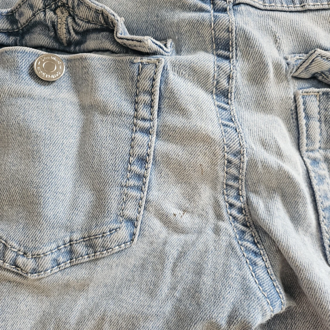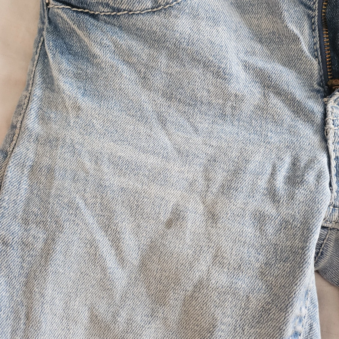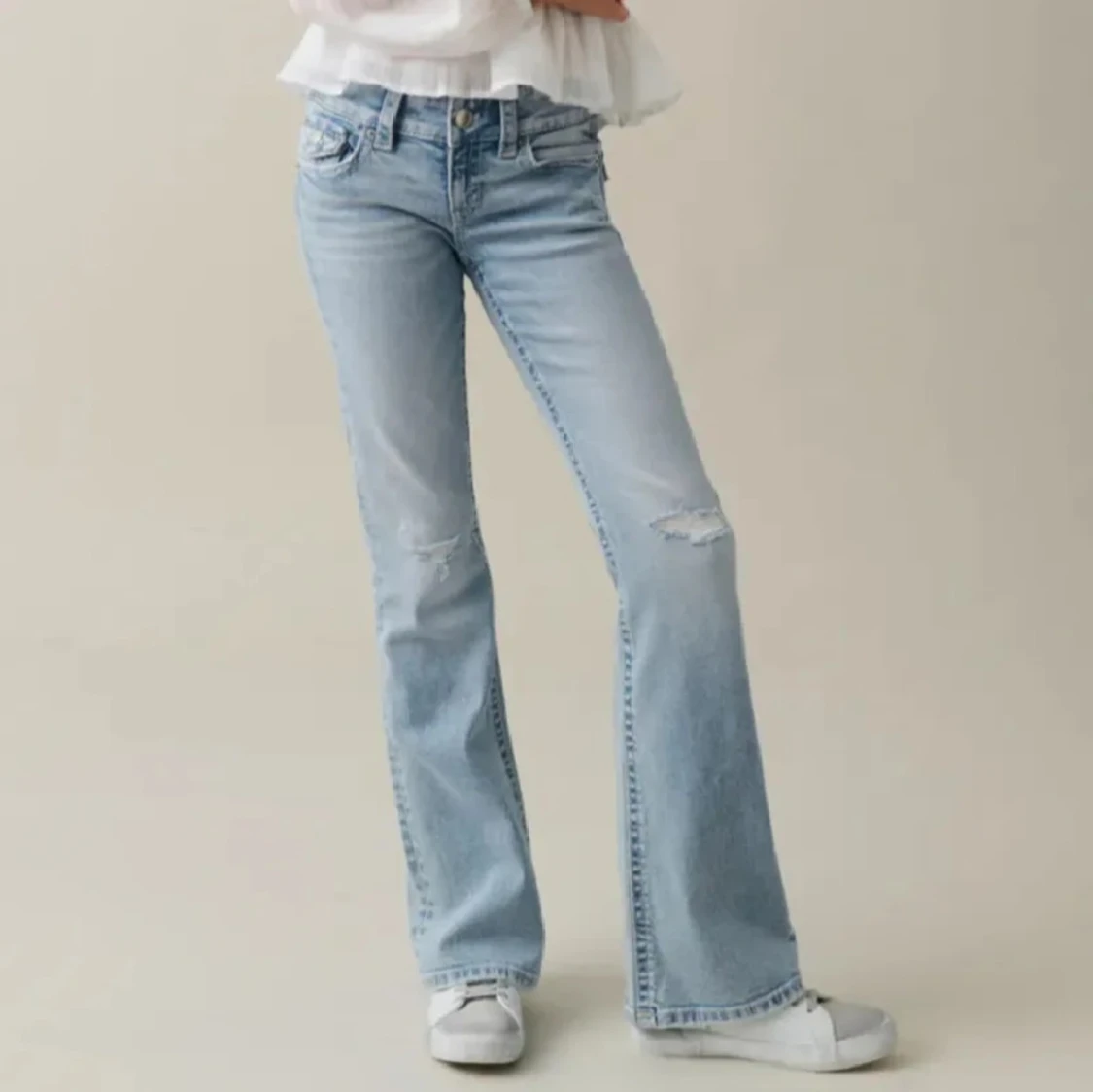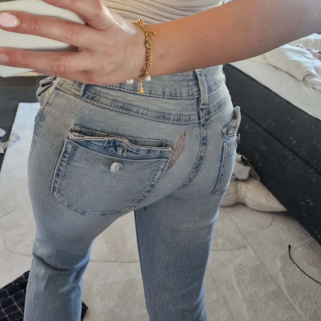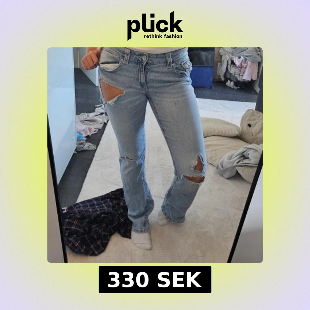 Säljer ett par ljusblå bootcut jeans Från gina som jag gjort flera hål i. Finns ett hål där bak så man ser igenom lite same några fläckar men inte så tydliga!